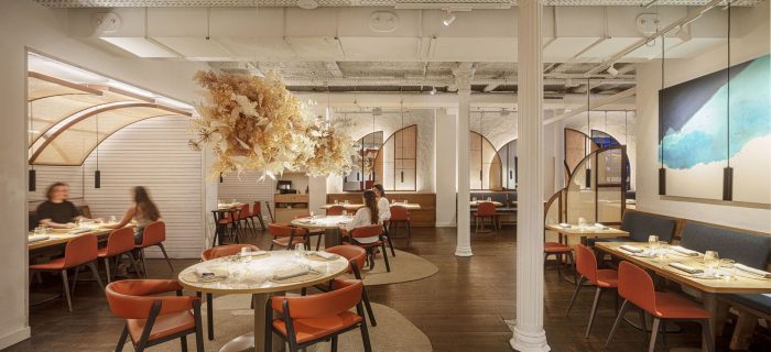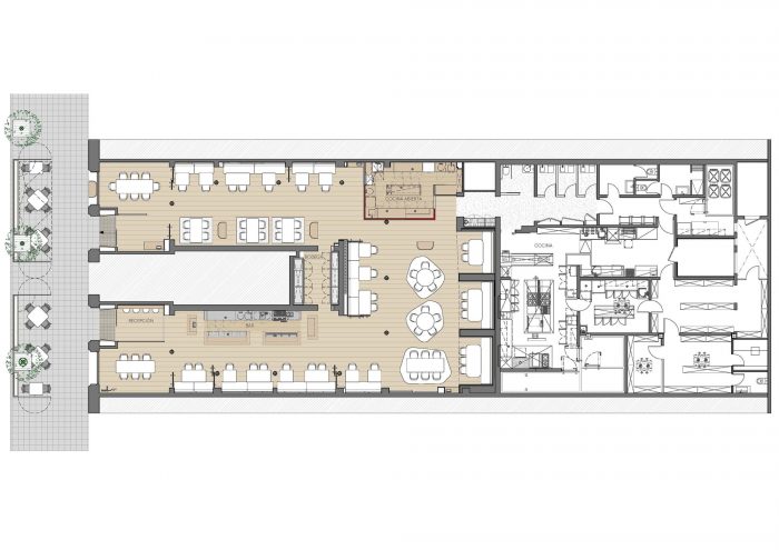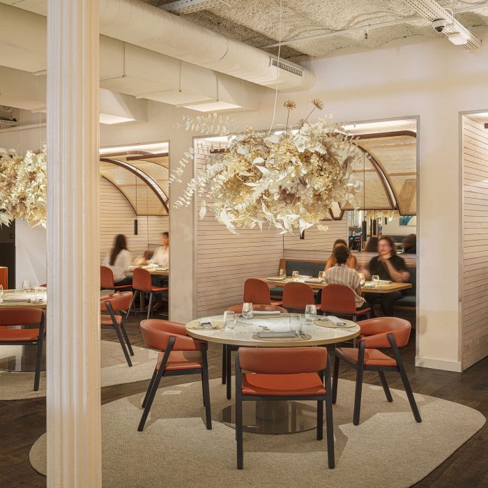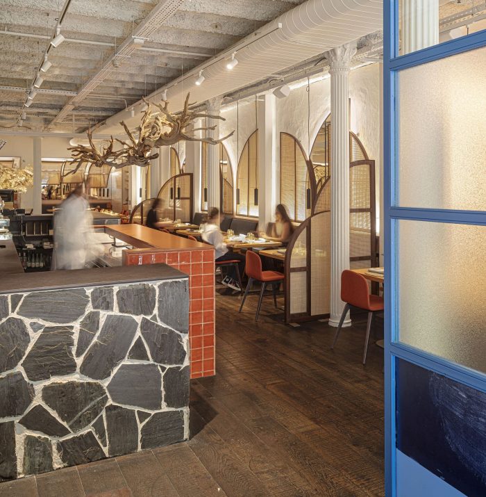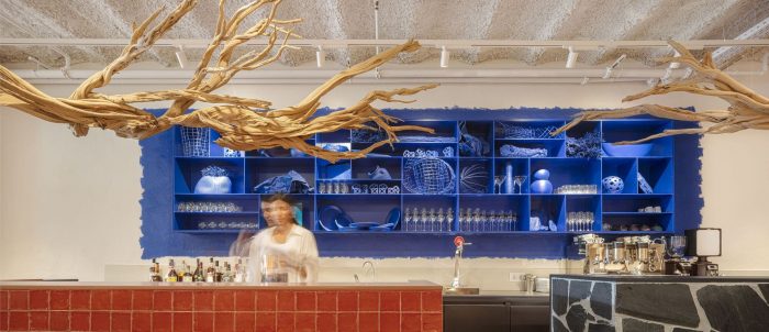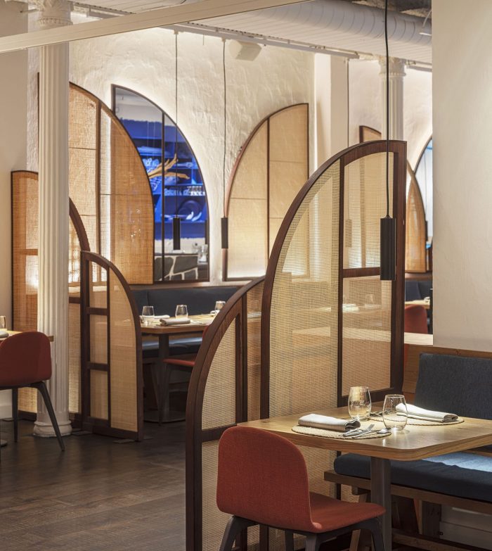 Brief & concept. Our clients aimed to bring the essence of the Mediterranean town of Cadaques, home of their first restaurant, to their new gastronomic concept in Barcelona. Slate roads, blue windows to the Sea, vessels rocking on the bay, and wicker craftsmanship invading its streets are part of the artsy spirit of Dali's town. Our design aims to recreate this picturesque spirit but reinterpreted from a contemporary urban perspective.