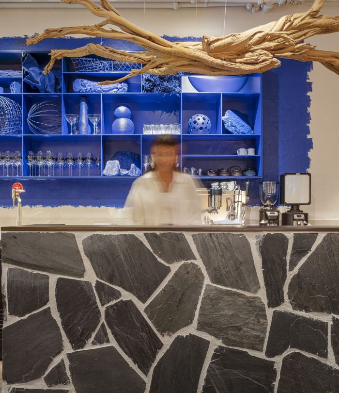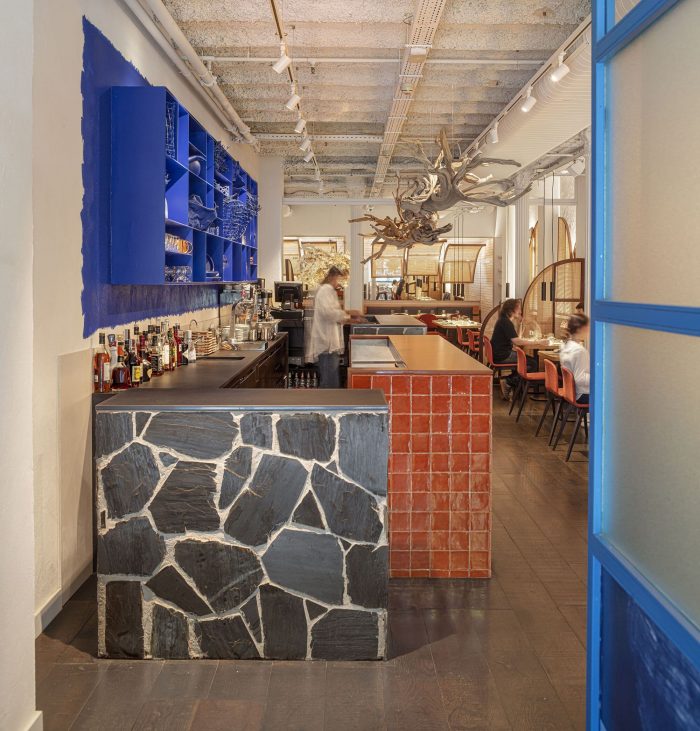 Materiality. We look for a warm, light materiality with a Mediterranean touch, translated into warm white textured surfaces and a general handmade touch. Different natural materials connect us with the architectural landscape of Cadaqués. The grey tone of the slate stone and its application in "trencadís" (traditional Mediterranean technique), together with the natural terracotta tile color, in contrast with the abstract and intense blue of the windows, create a powerful set that can be read in almost pictorial terms and are intended to dialogue with the stunning compositions of colour and texture of the dishes of the Restaurant Compartir.