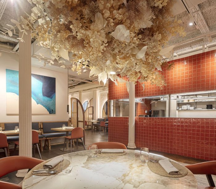 该餐厅位于Eixample区的一个经典场所,有一个上世纪初的壮观的钢结构。其中一个空间,人们会设想一个有大型抽象画的艺术画廊,这在这个街区非常普遍。因此,我们对设计进行了想象:一个宽敞的白色空间,由三个面向地中海的蓝色抽象 "窗口 "主持:一个雕塑、一个绘画和一个纺织品窗口。每个 "窗口 "都成为与不同的当地艺术家合作的机会,我们与他们一起为餐厅创造了定制的作品。
