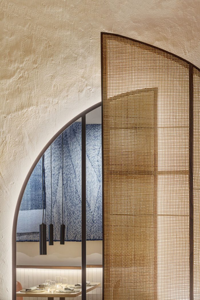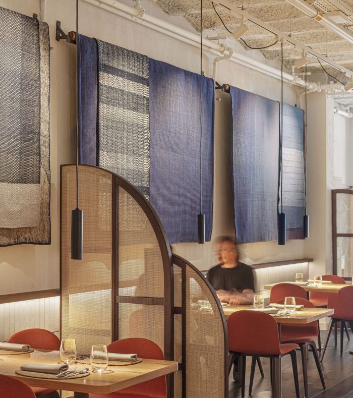 100% local. All the materials and products used in the project are 100% local, together with the artists and artisans with whom we collaborated to create custom-made pieces for the restaurant. The restaurant is in a classic venue in the Eixample district of Barcelona, with a spectacular steel structure. One of those spaces where one would envision an art gallery, which is so common in this neighborhood. And so it is that we have imagined the design: an ample white space presided by three blue abstract "windows" towards the Mediterranean Sea: a sculptural, a pictorial, and a textile window. These "windows" were custom-designed and created in collaboration with local artists and artisans.