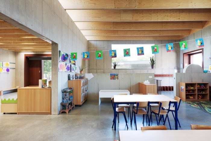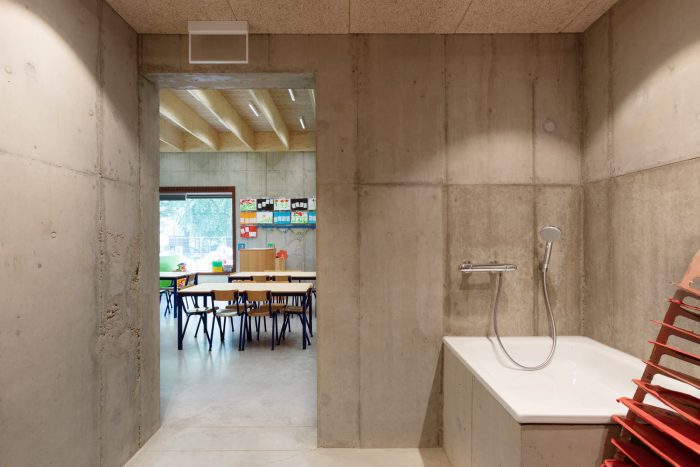 The new nursery school is conceived as a clever concatenation of two pairs of classrooms with one large and one small class linked together. All classrooms are connected like an enfilade to allow for joint use of classrooms and encourage interaction between classes and teachers. The sanitary and technical rooms are placed at the pivot between the two pairs of classes.