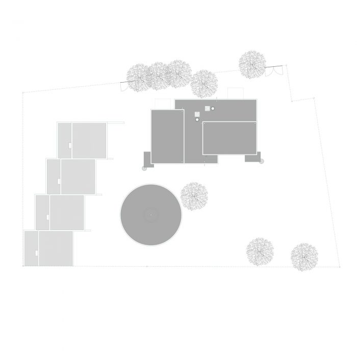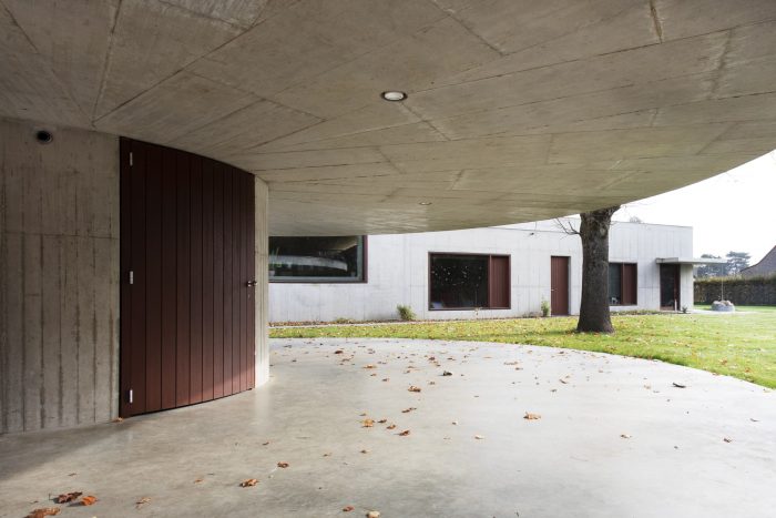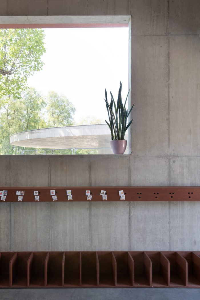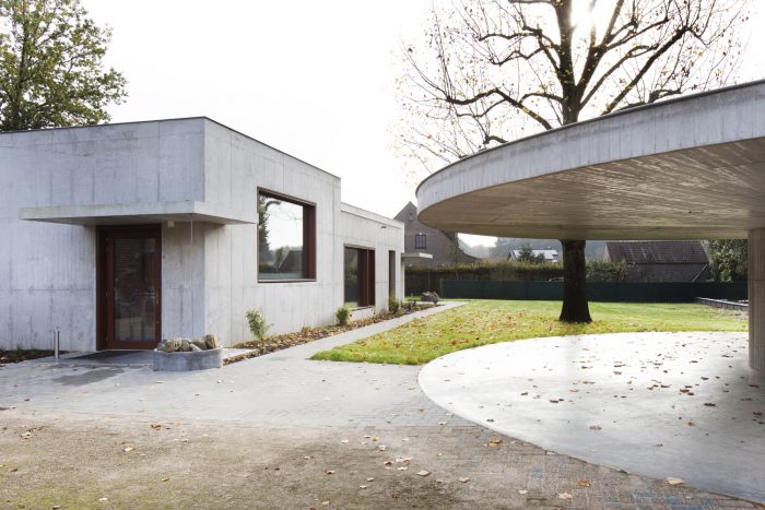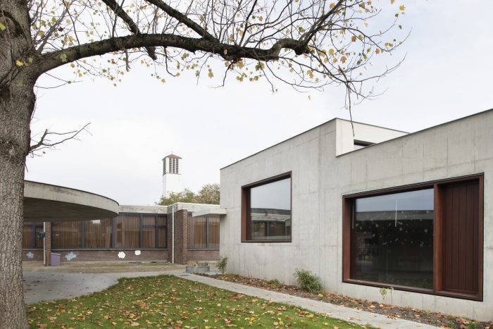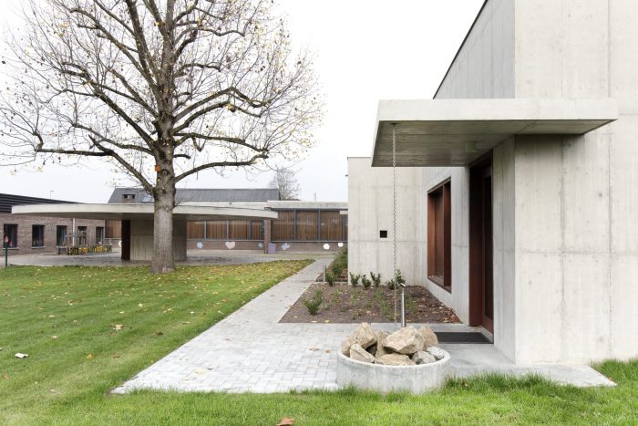 On an existing school site in the Flemish village center of Boekt, four new classrooms are being built to complement the existing nursery school. The massive and compact new building in fair-faced concrete is set perpendicular to the existing school building and brings the school into a relationship with the public domain. To connect the two buildings, a circular concrete canopy is placed centrally.