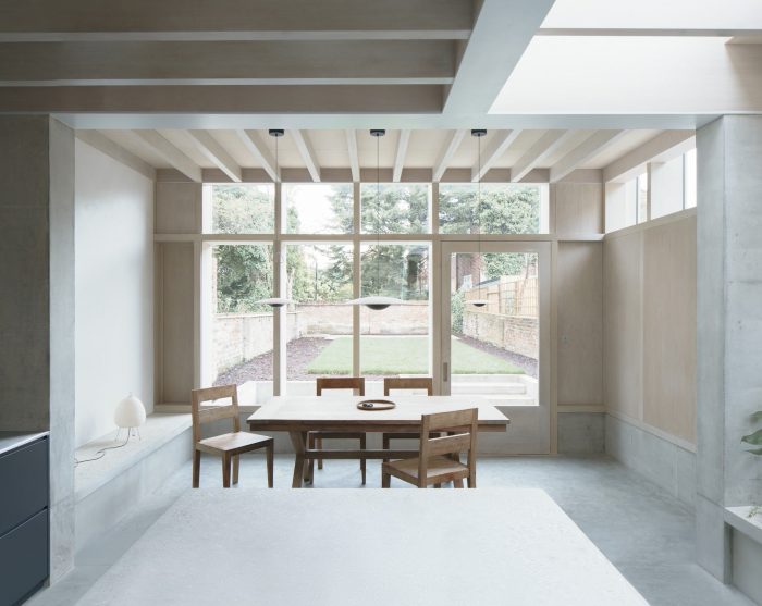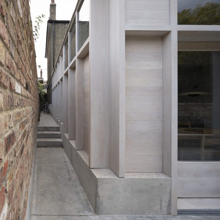 The heaviness of the concrete is balanced by the use of soft oak joinery and a large skylight above the kitchen island. Simple oak sash windows draw in yet more light in a nod to the traditional glazing of Victorian-era terraces, and extend the width of the kitchen onto the leafy side return passage.