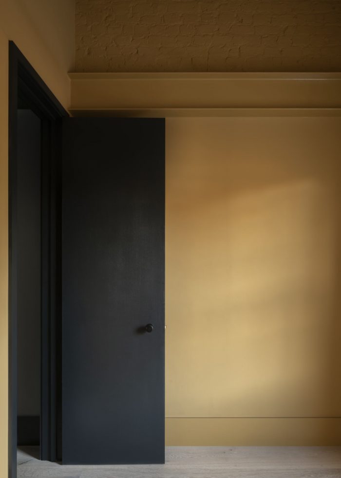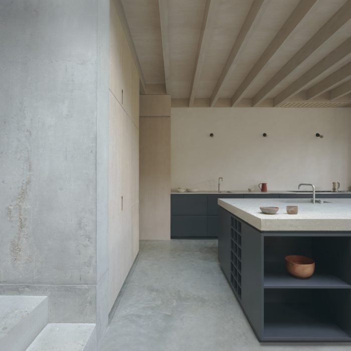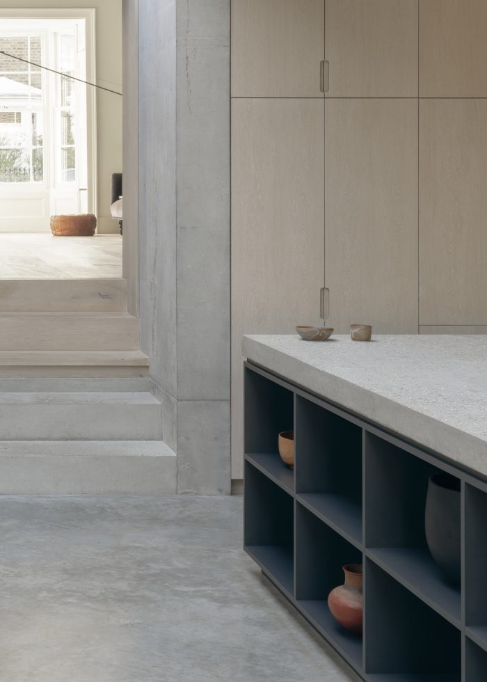 Dinesen timber floors and muted terrazzo tiles draw visitors into the kitchen where the clients’ love of concrete is celebrated. Long, low concrete benches grow from the concrete floors to line the perimeter of the kitchen and dining space as multi-purpose seating, staging, and display options. The concrete kitchen worktop floats on smokey Farrow & Ball ‘Railings’ cabinetry, met by microcement rendering to the upper walls. A hidden cellar door leads down to a utility space to keep functional clutter out of sight.
