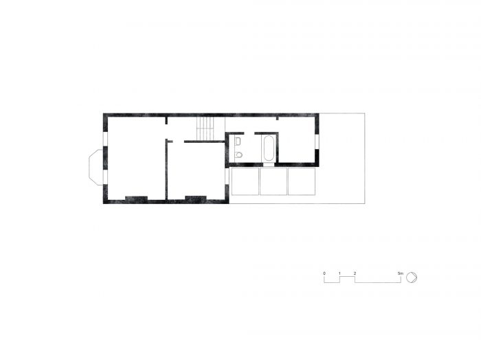 楼上的DGN工作室采用了一种更轻盈的方式,拆除了一个废弃的烟囱,并将浴室重新组织成一个功能齐全、光线充足的私人空间。卫生间的窗户以前可以看到相邻的淋浴间,因此DGN工作室将其移到对面,并在浴缸上方增加了一个天窗,为客户和邻居重新引入了光线和隐私。