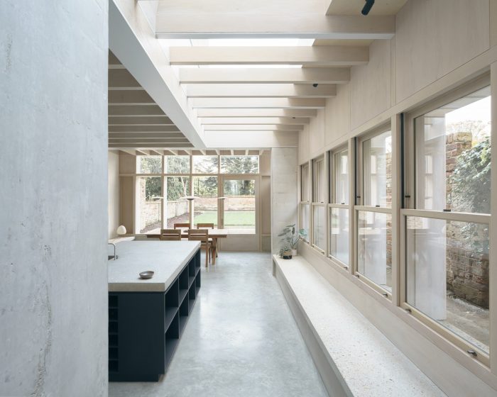 混凝土的厚重感被软橡木的使用和厨房岛上方的大天窗所平衡。简单的橡木窗吸引了更多的光线,向维多利亚时代露台的传统玻璃窗致敬,并将厨房的宽度延伸到绿树成荫的侧面通道。