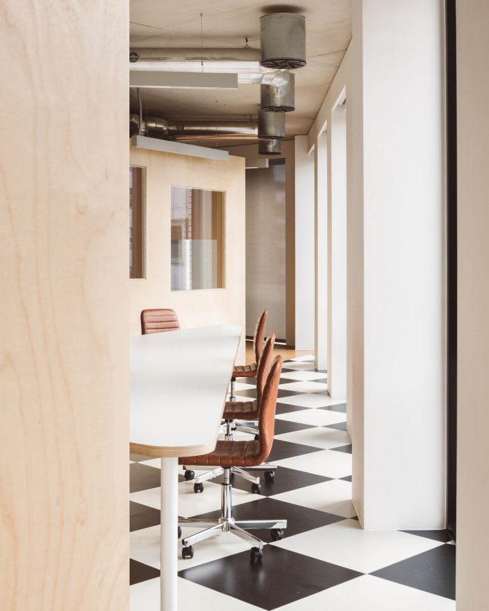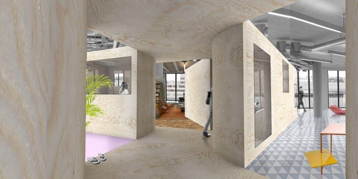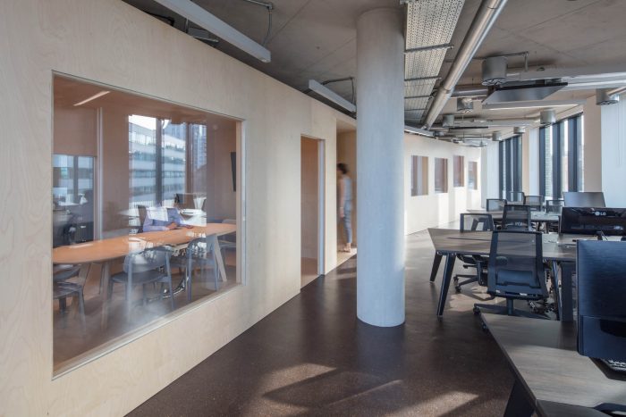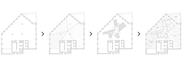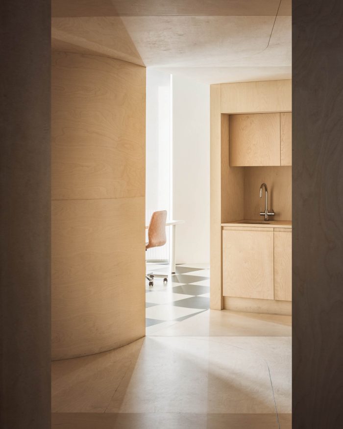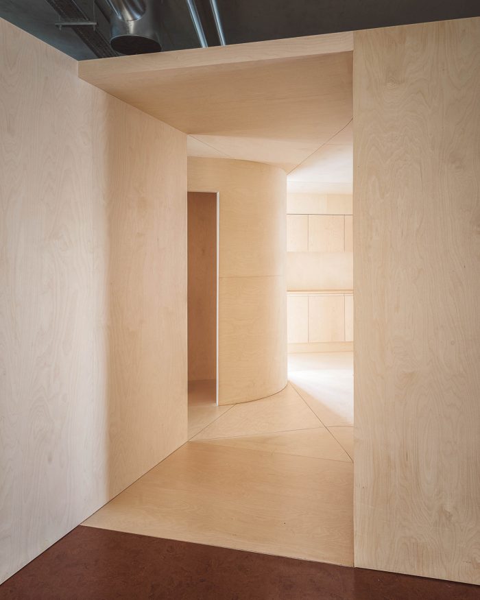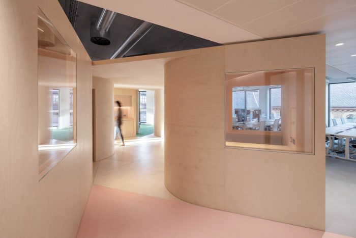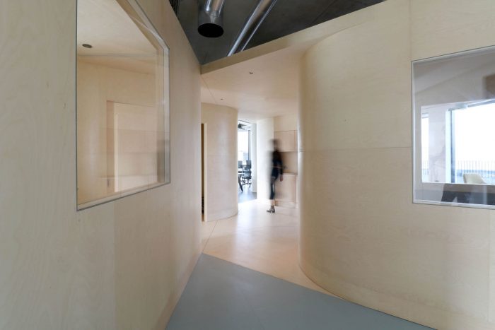 Windows in the central plywood object are aligned to create views across each floor, moments of permeability that stitch together the various work environments. In this way the spaces are both distinct and connected, a collage of different material and experiential environments held loosely together by the geometry of the central object on each floor.