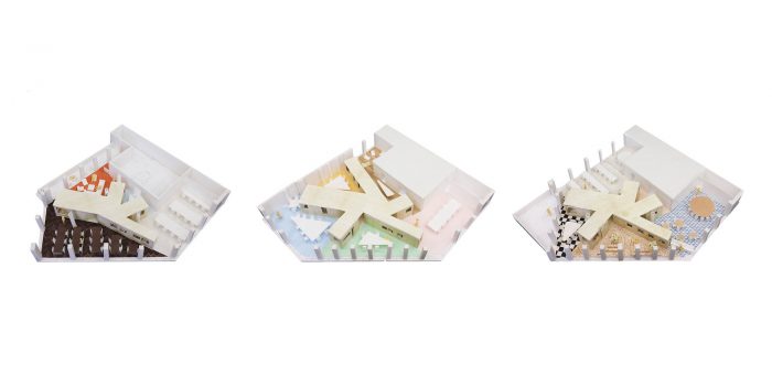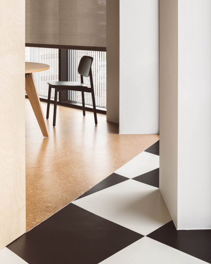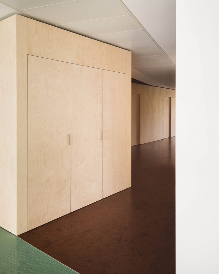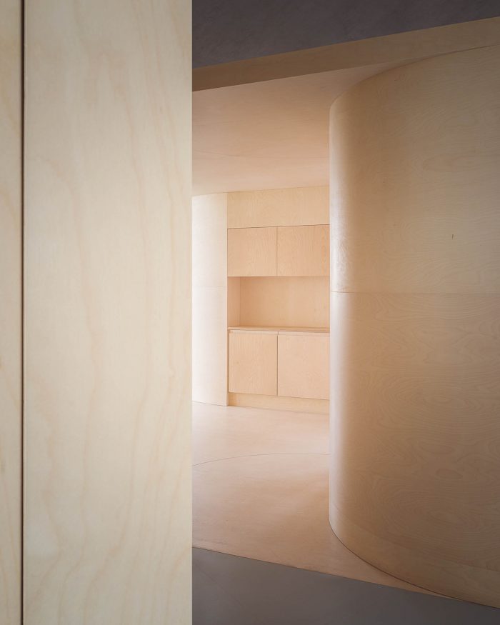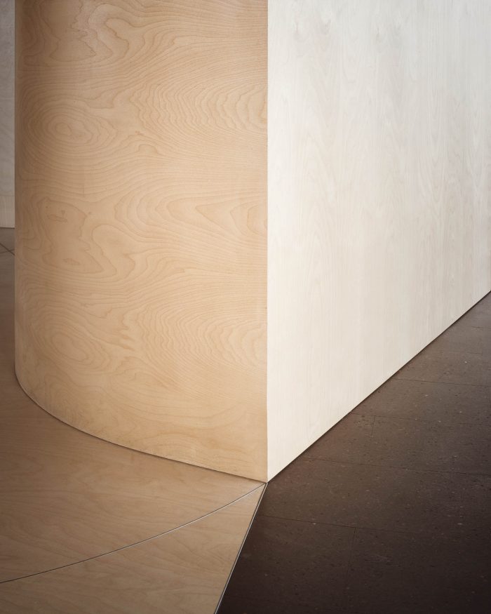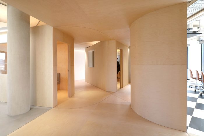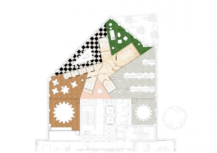 Windows in the central plywood object are aligned to create views across each floor, moments of permeability that stitch together the various work environments. In this way the spaces are both distinct and connected, a collage of different material and experiential environments held loosely together by the geometry of the central object on each floor.