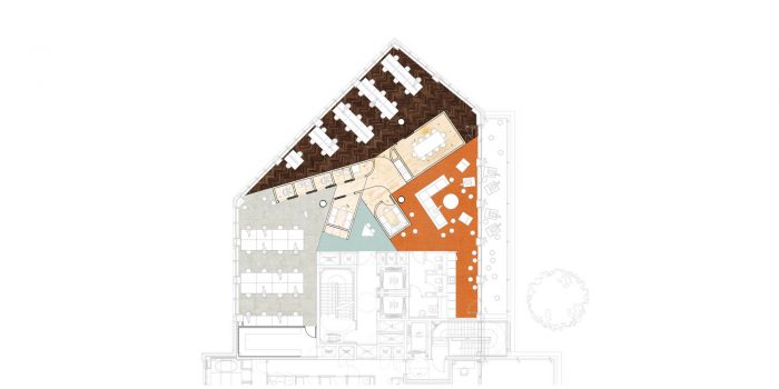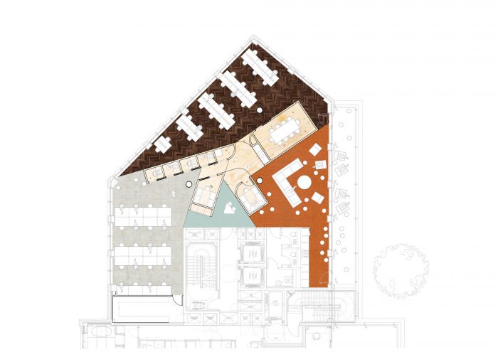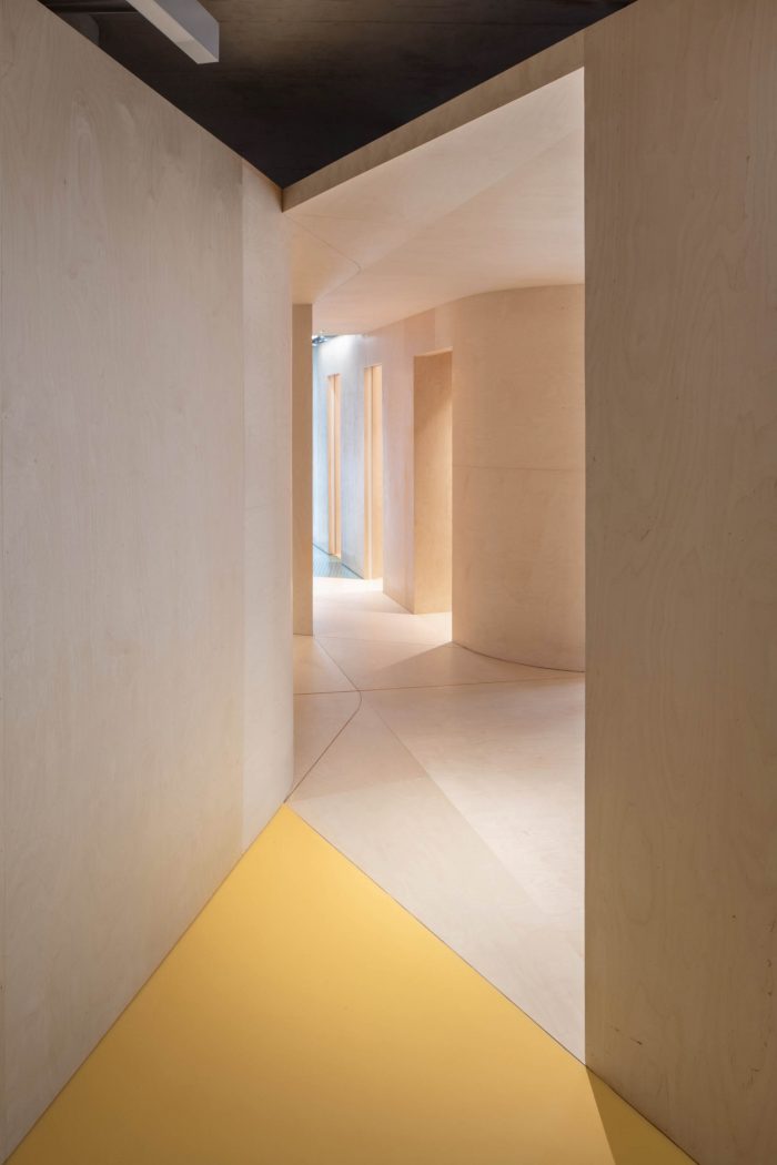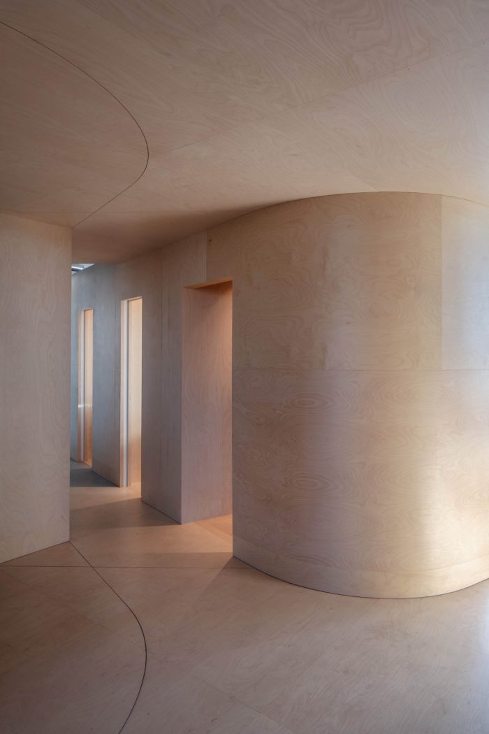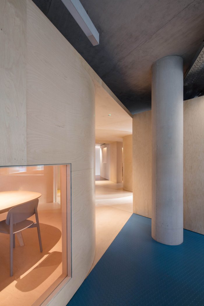 中央胶合板物体上的窗户被排列起来,以创造跨越每一层楼的视野,这种渗透性的时刻将各种工作环境连接在一起。通过这种方式,这些空间既有区别又有联系,不同材料和体验环境的拼贴被每层楼的中心物体的几何形状松散地联系在一起。