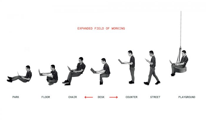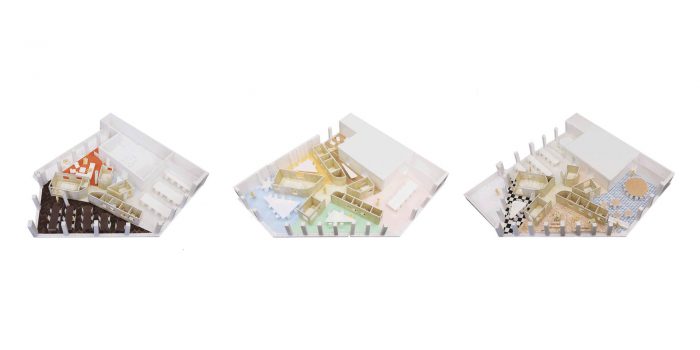 Surrounding the central object are distinct work environments. Each space alludes to a metaphorical location to establish both an atmosphere and a set of ‘’ground-rules’’ for how work is to be carried out. The Laboratory with its light grey flooring, white furniture, and sanitized fluorescent light is an open but distraction-free space for focused work.