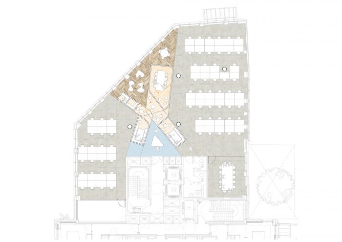 The project challenges received assumptions about the value of openness and flexibility in workplace design, and instead creates a variety of distinct spaces carefully tuned to support different modes of work. Specifically, we’ve introduced an “object” into the center of each floor to loosely divide the space into distinct work environments, each with a unique material palette and associated atmosphere. The space of the central object hosts meeting rooms and phone booths of varied sizes and acts like a palette cleanser, providing a neutral space of transition and gathering on each floor.
