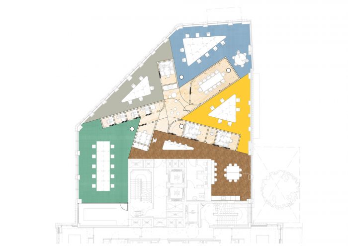 该项目挑战了关于工作场所设计中开放性和灵活性价值的假设,而是创造了各种不同的空间,以支持不同的工作模式。具体来说,我们在每层楼的中心引入了一个 "物体",将空间松散地划分为不同的工作环境,每个环境都有独特的材料色调和相关氛围。中央物体的空间容纳了不同大小的会议室和电话亭,就像一个调色板,为每层楼的过渡和聚会提供了一个中性的空间。