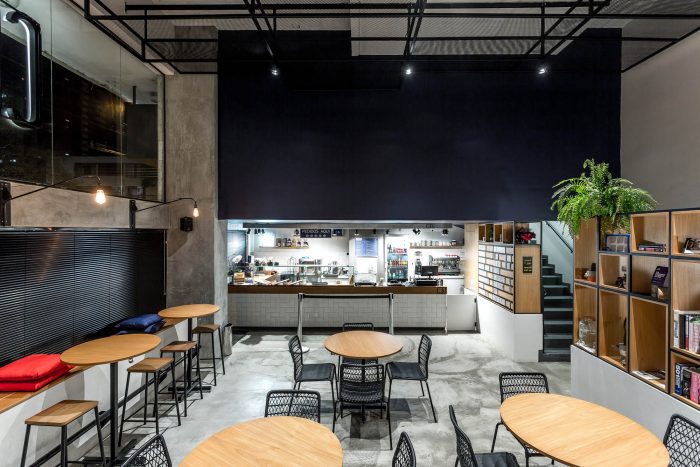 The materiality of the design is made with a reduced palette of colors and materials, cool but balanced by the presence of wood in the tactile furniture and the coffee products. Also worthy of mention is the presence of a modulated bookcase at the back of the hall, used to separate the flow from the bathroom and kitchen, located on the mezzanine, and also serving as support for decoration, product display and support. The living spaces of the hall create an informal dynamic, offering three options to the user - low tables, high tables and a grandstand. This creates an atmosphere familiar to the user, something like a large living room where everyone is welcome.