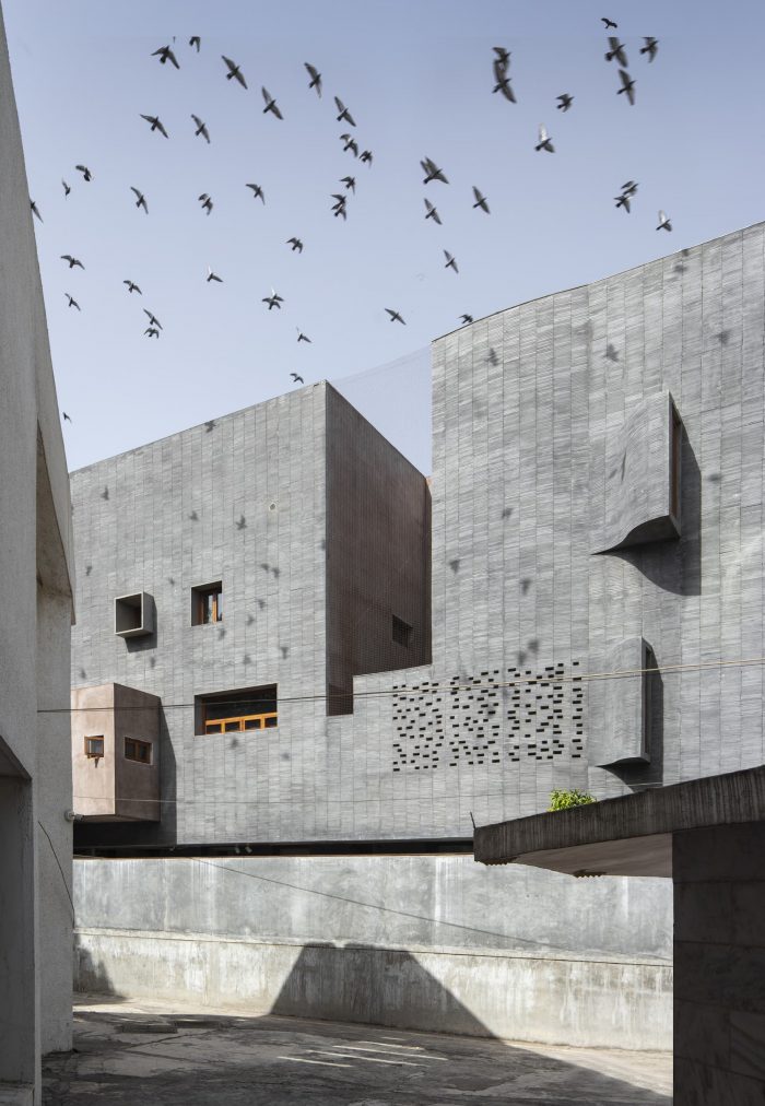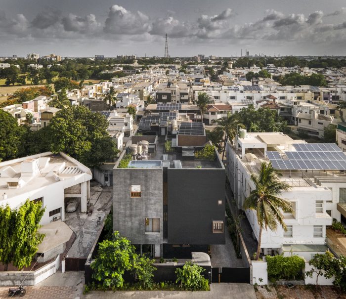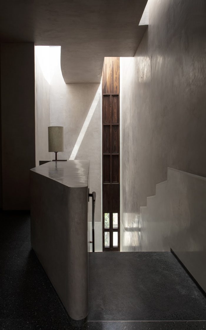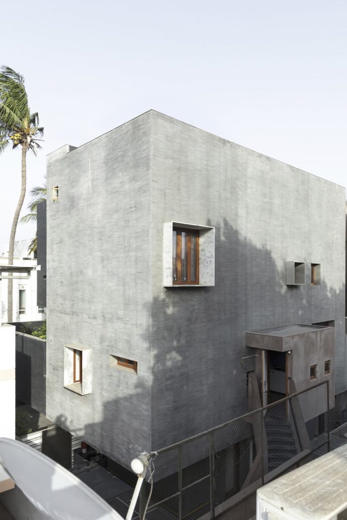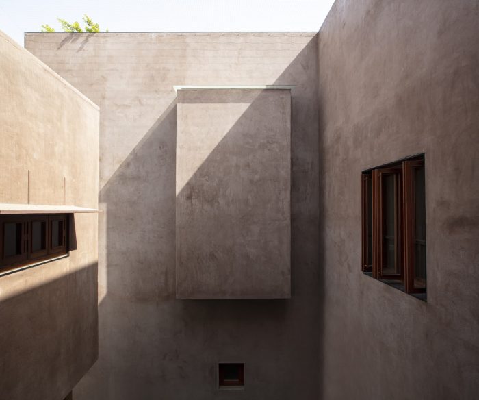 Designed like a track with rooms on either side the house is punctured vertically making two courtyards on either side of the central track-like corridor. The courtyards begin from the first floor and frame views of the sky from the house. Being in a tight row house fabric in the town the context really is another house in great proximity. The house is designed like a box, rather inward-looking with windows that are strategic to bring in the cool breeze and diffuse the sharp light. The south facade is kept fairly dead and the wind is allowed to pass from the southwest courtyards and escape from the northeast courtyard ventilating the entire house.