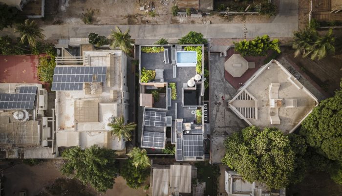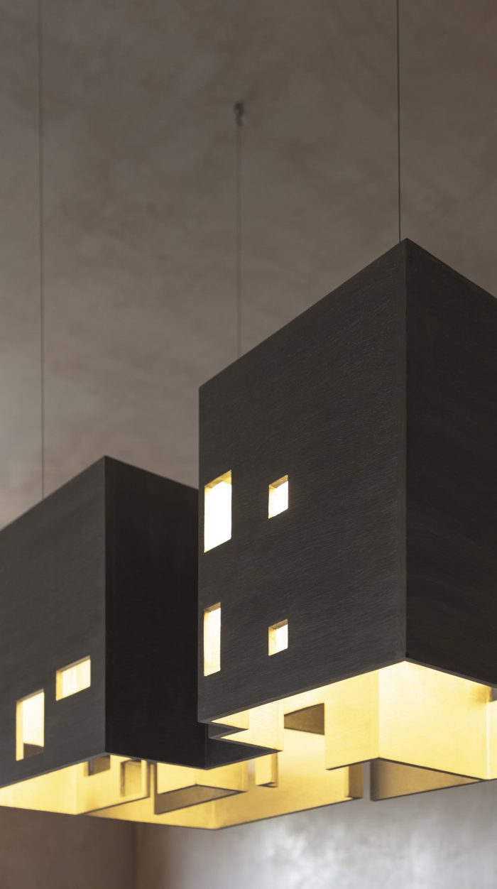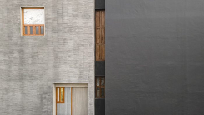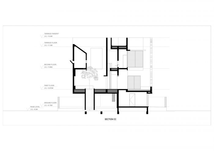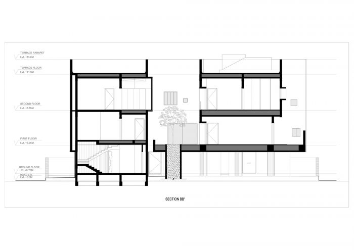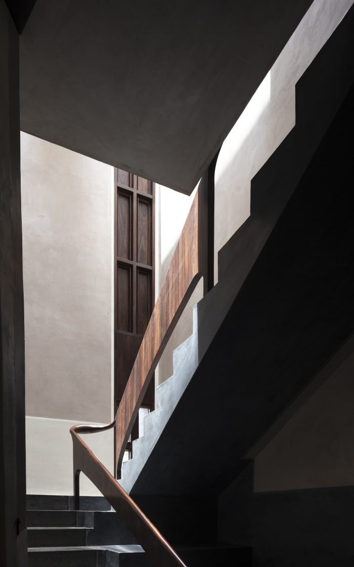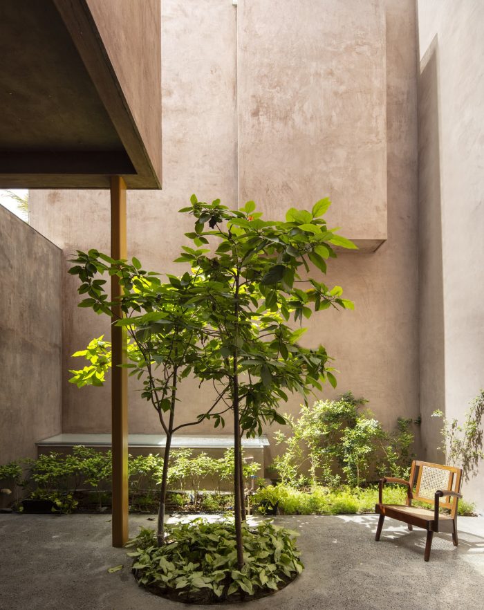 Designed like a track with rooms on either side the house is punctured vertically making two courtyards on either side of the central track-like corridor. The courtyards begin from the first floor and frame views of the sky from the house. Being in a tight row house fabric in the town the context really is another house in great proximity. The house is designed like a box, rather inward-looking with windows that are strategic to bring in the cool breeze and diffuse the sharp light. The south facade is kept fairly dead and the wind is allowed to pass from the southwest courtyards and escape from the northeast courtyard ventilating the entire house.