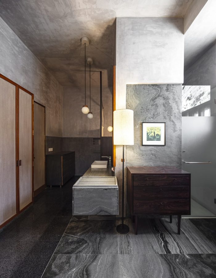 One courtyard has shallow waterbody that cools the incoming wind before it enters the house. This courtyard also has a jali that allows for the wind to be channeled and then thrown into the house like a whiff of a cool breeze on a summer afternoon. The other courtyard has trees on the first floor making a sort of context for the house from within and allowing internal windows to see the tree crowns. Although inward looking there is a constant choreography of inside and outside movement within the house where you encounter the courtyards and can step out to them from the central track.