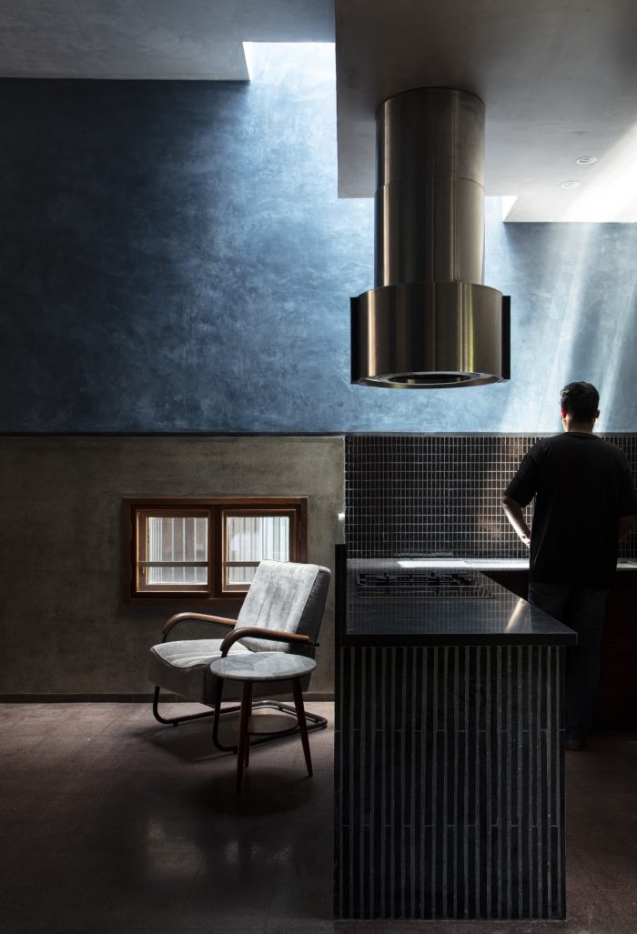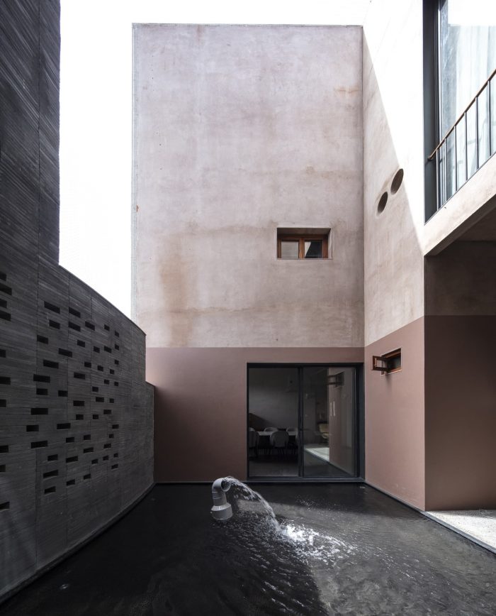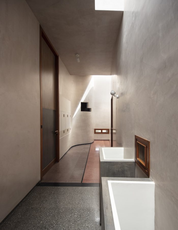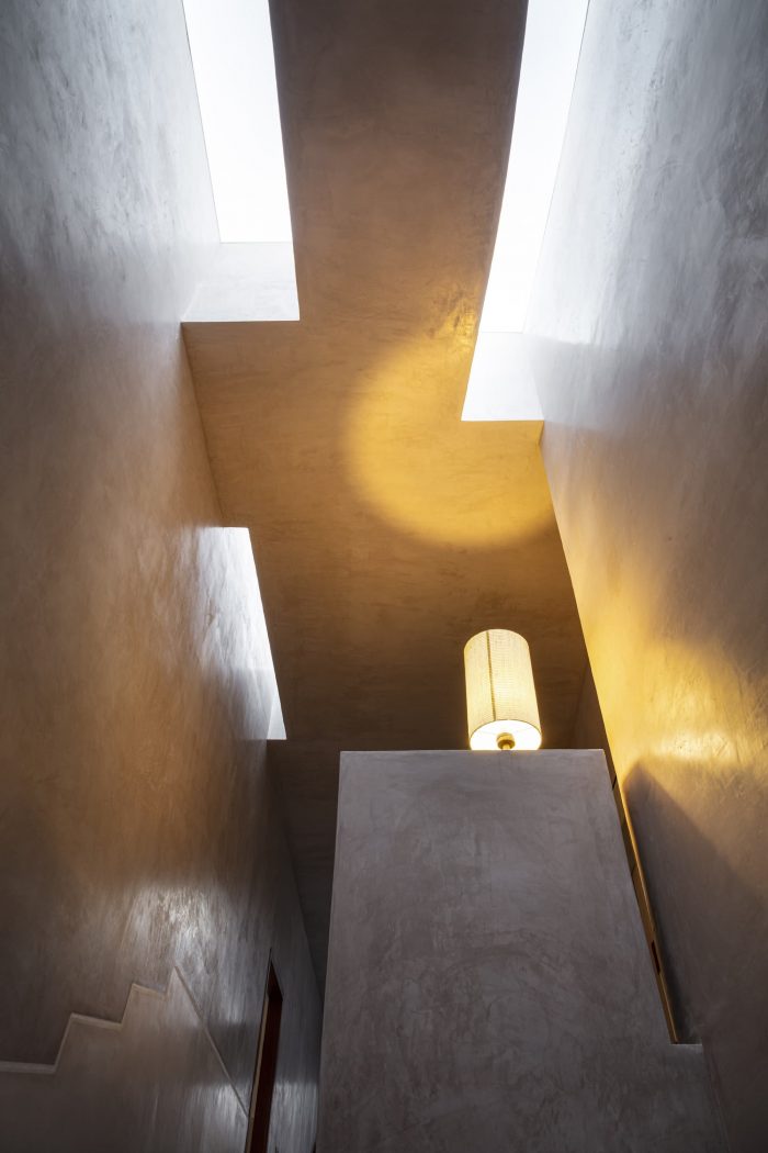 房子的设计像一条轨道,两边的房间被垂直打穿,在中央轨道般的走廊两边形成两个庭院。院子从一楼开始,从房子里可以看到天空。处于小镇上一个紧凑的排屋结构中,环境确实是另一个非常接近的房子。房子被设计成一个盒子,相当内向,窗户是战略性的,可以带来凉爽的微风和散射尖锐的光线。南面的立面保持了相当的死角,风被允许从西南面的院子里通过,并从东北面的院子里逸出,给整个房子通风。