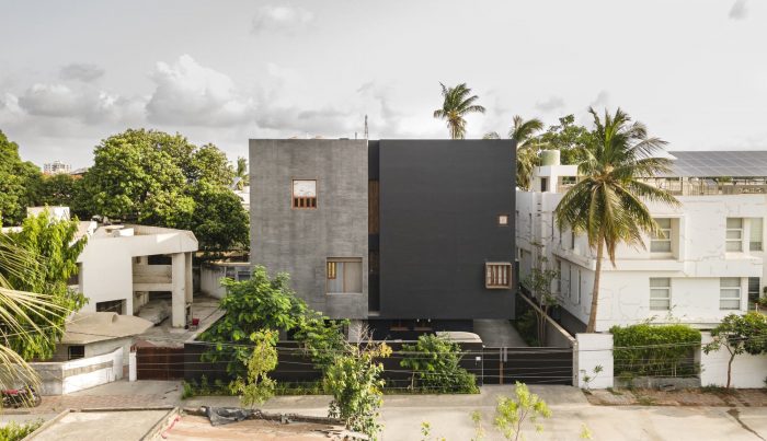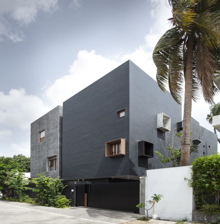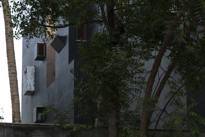 To help with beating the heat, the house also has thick external walls and a cool soothing interior done in lime "chuno" that helps cool the rooms from within. The house is an example of contemporary architecture that heavily relies on our innate knowledge of climate and materials that work in such harsh climate regions. The house, like a box from the outside, has unique materiality, one painted black and the other very tactile using small custom cute siporex bricks, the semantics makes the logic of a track corridor and volumes on either side very evident. Small pockets have been identified within the mass that punctures it and green is allowed to grow from within.