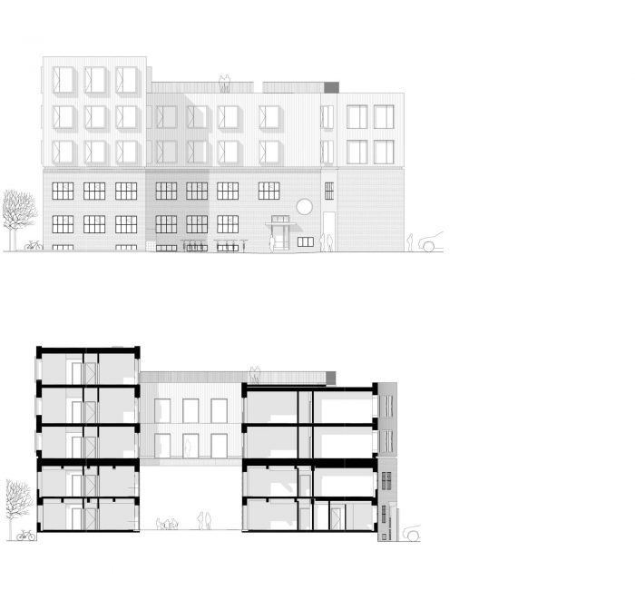 The curved shapes of a 1936 modernist building have been extended in height in a new addition. The transformation clarifies the crescent in the street of the former factory building. The old building has been designated with a high conservation value from the conservation authorities. The task of adding the new extension has therefore included great care for the existing architecture.