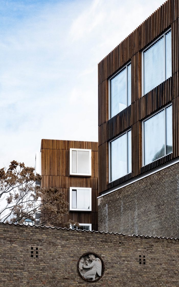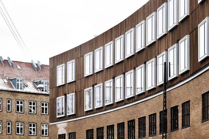 The new facades above the old building are covered in ash wood cladding with a tactile slatted structure that provides relief and texture in the façade. The golden-brown bricks in the two lower floors thus form a patinated base for the new crisp upper part, which over time will change the character to a silver-gray surface. Where it has been necessary to repair the existing outer wall, it is rebuilt with a yellow hand-stroke tile.