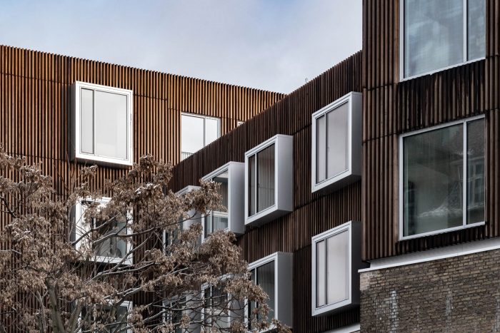 The façade towards the street follows the shape of the street and is symmetrically built with rhythmic window openings and a convincing sense of proportion. Holscher Nordberg Architecture and Planning has developed a special window for the transformed building. The windows have a vertical spear mounted in the center profile, so that subtle shadow effects occur, which play a visual role in the relief motifs created by the upper wooden façade. All the dwellings have at a bay window to set a generous special frame in the relatively small homes.