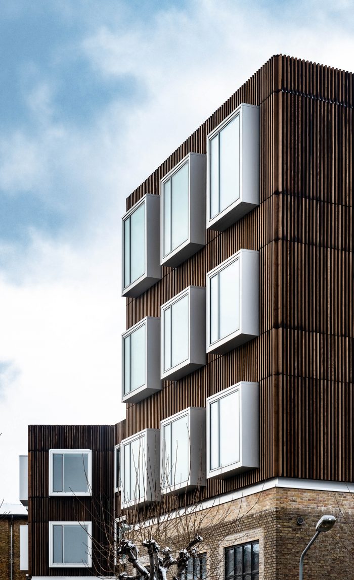 旧建筑上方的新外墙采用了白蜡木覆面,其触感为板条结构,为外墙提供了浮雕和纹理。因此,下面两层的金褐色砖块为新的清脆的上部形成了一个斑驳的基础,随着时间的推移,它的特征将改变为银灰色的表面。在有必要修复现有外墙的地方,它被重建为黄色的手划砖。