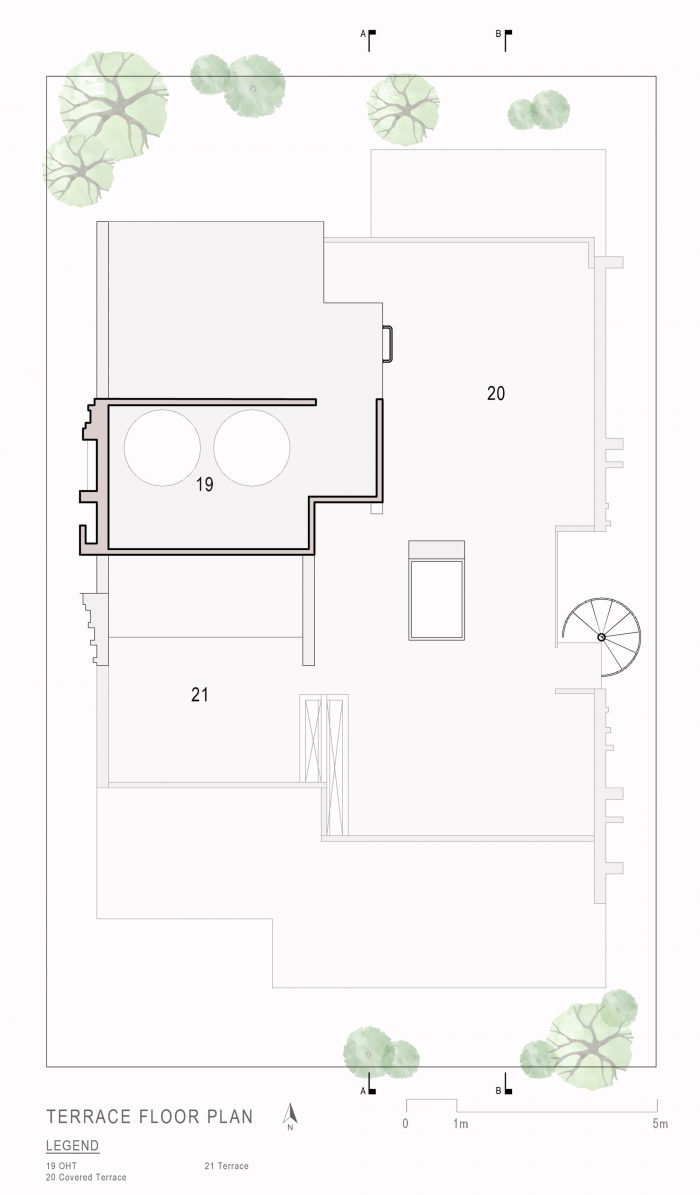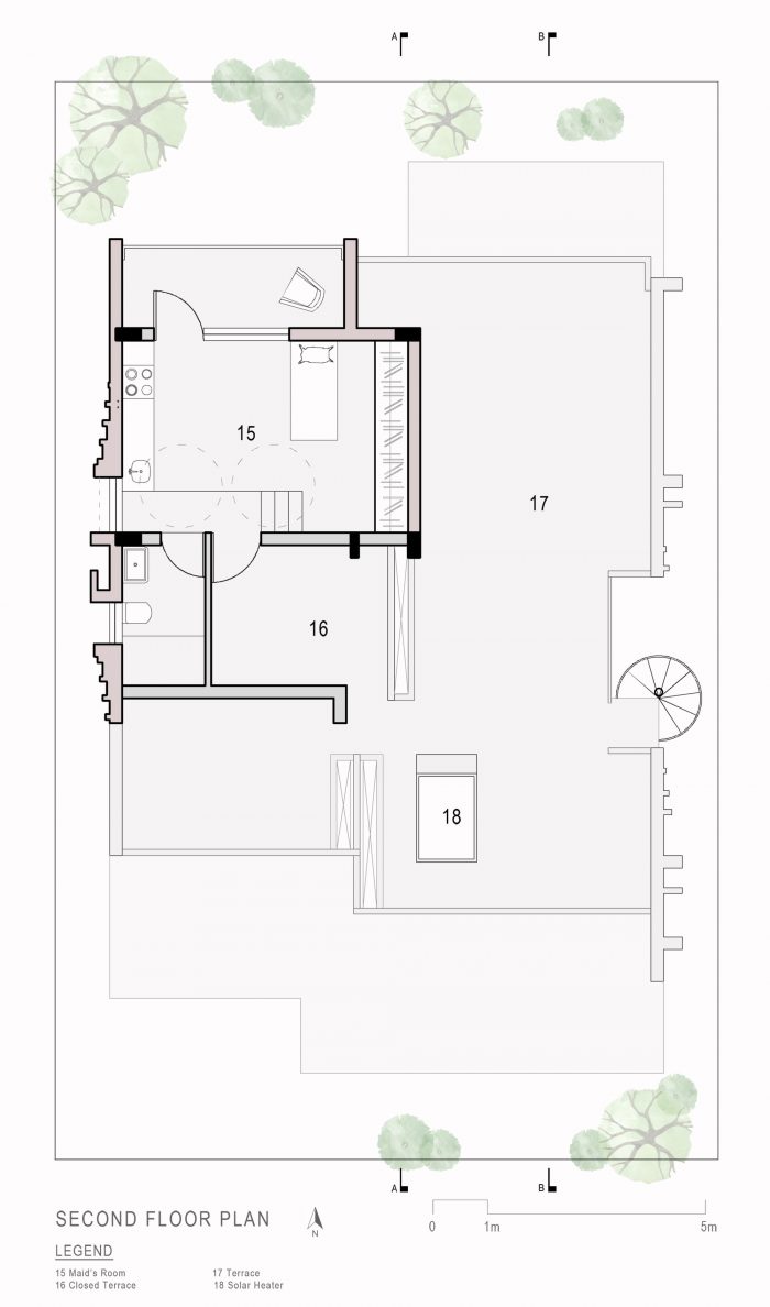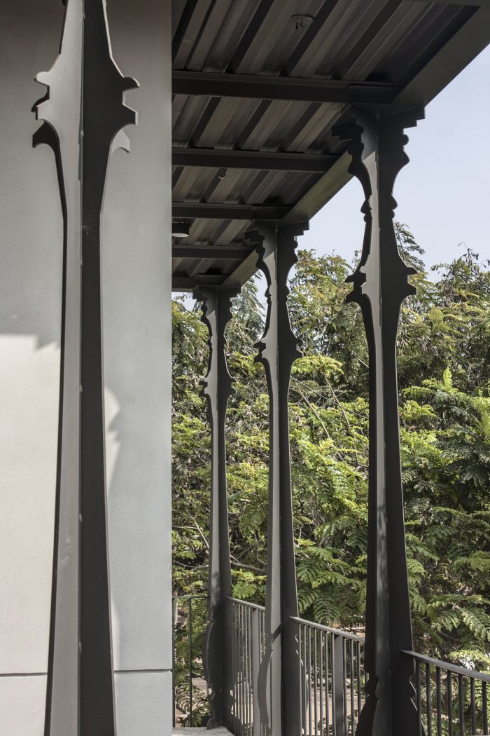 我们用金属板制作了这些柱子,切割成与传统柱子的轮廓相匹配的形状,并作为一个十字架放置。这些柱子框住了房子的正面,坐在一个大的连续悬空的阳台上。前面的悬空不仅保护了南面的立面,而且还允许充足的交叉通风。规划一直保持简单。开放的、连续的公共和半公共空间与客人的卧室都在一楼。夫妇俩和他们的孩子的个人私人空间,以及一个独立的家庭区域都在一楼。将该计划设计成一个外向型结构的主要工作是为了充分利用景观。前面是一条安静的街道,后面是一个公园。楼梯上方有一个位于中央的天窗,通过在上层的通风帮助空气的流动,使空气得到温和的流通。