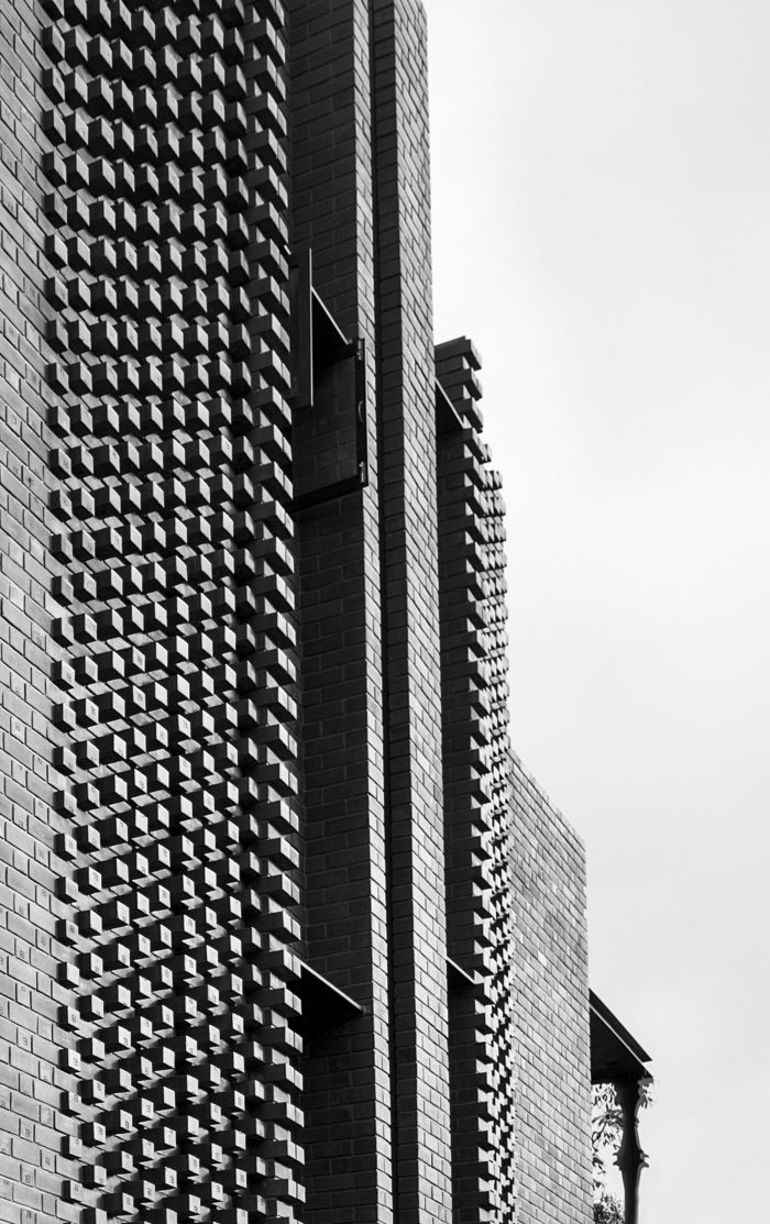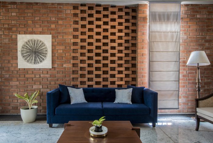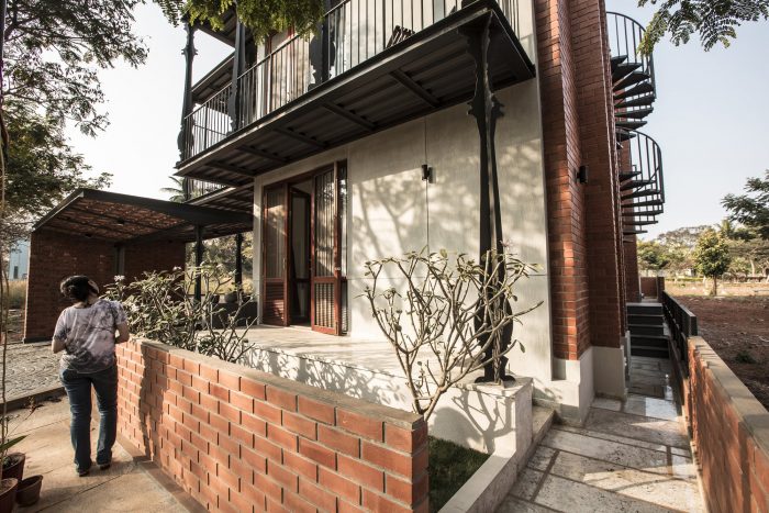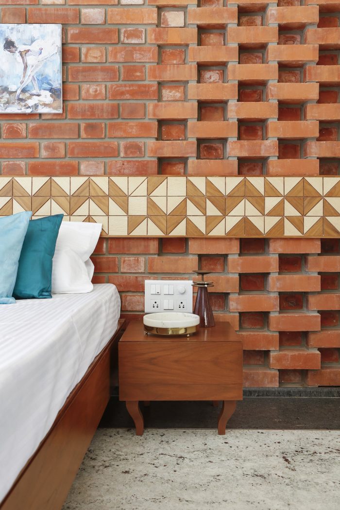 The two sides of the building show the strong presence of exposed brick masonry. The earthy terracotta colour makes a direct reference to the materiality of Kerala architecture and stands in sharp contrast to the light metal balconies pushing through in the front and rear. Openings in the masonry are kept minimal in order to accentuate the openness in the front and rear. The undulating brick masonry is a playful interpretation of a Mangalore tiled roof surface – another element seen extensively in Kerala. The masonry swells out to allow for openings and is constructed using the Flemish bond. As the brick gradually corbels outwards, its negative imprint is seen on the inner side - almost as an acknowledgement of the drama outside!