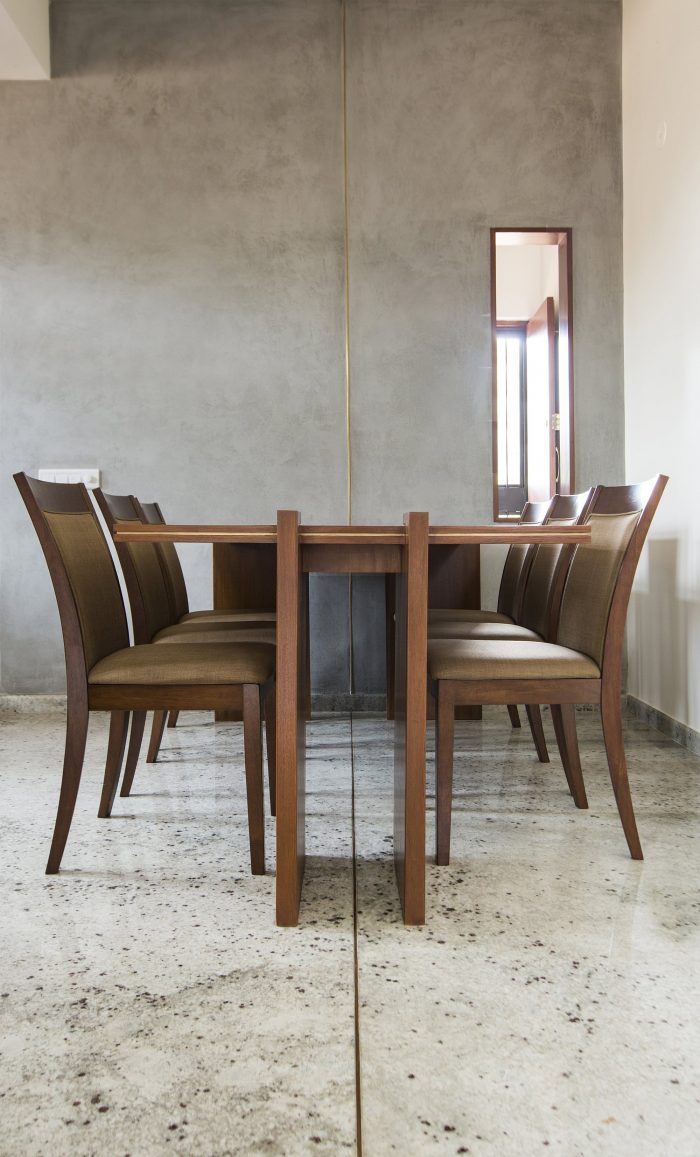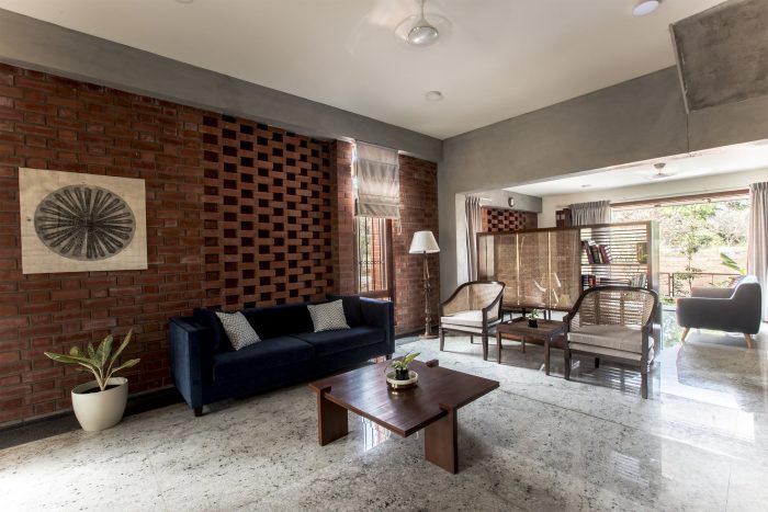 The use of materials for the interiors was also inspired by those seen in a traditional Kerala home. The combination of cane screens with teak wood is an attempt to add that element of nostalgia to an otherwise minimal interior. The continuous, almost monolithic granite floor helps further accentuate the open ground floor plan. The house is powered by solar panels placed on the roof of the structure.