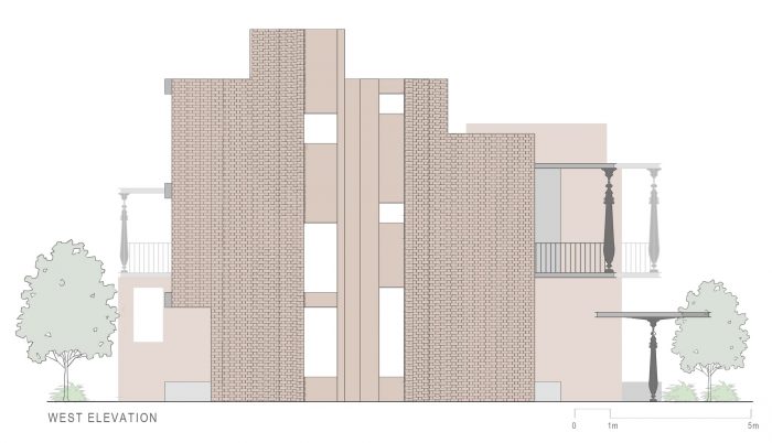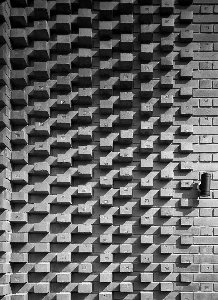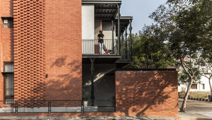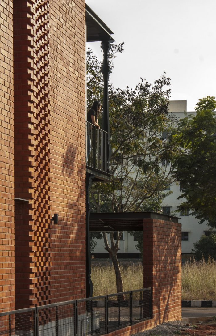 建筑物的两边显示出暴露的砖砌体的强烈存在。泥土的赤土色直接参考了喀拉拉邦建筑的材料性,并与前面和后面的轻金属阳台形成鲜明对比。砖石上的开口保持最小,以突出前后的开放性。起伏的砖砌体是对曼加罗尔瓦片屋顶表面的俏皮解释--这是在喀拉拉邦广泛见到的另一个元素。砖砌体膨胀,以允许开口,并使用弗拉芒债券建造。当砖块逐渐向外倾斜时,它的负面印记就会出现在内侧--这几乎是对外面的戏剧性的认可
