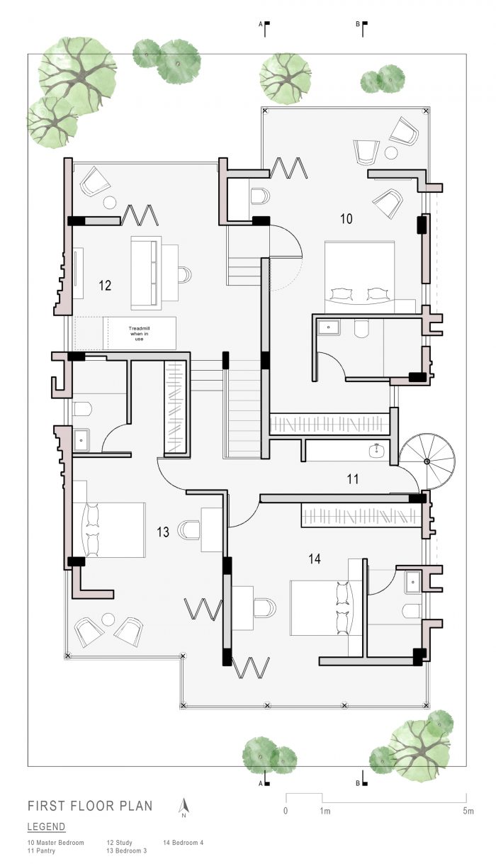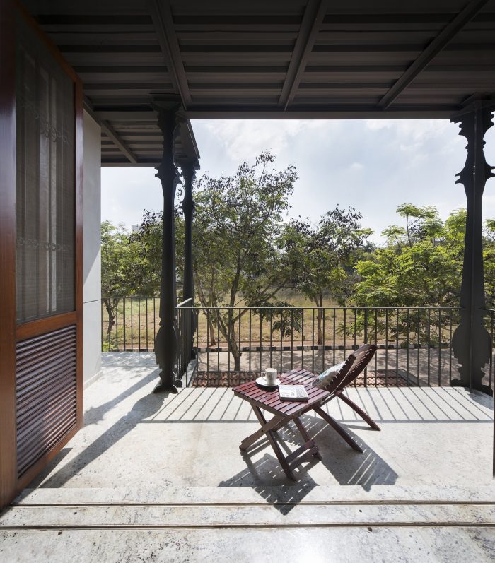 We fashioned them using a metal sheet, cut out to match the silhouette of a traditional column and placed as a cross. These columns frame the front of the house and sit on a large continuous overhanging balcony. The overhang in the front not only protects the south façade but also allows for ample cross ventilation. The planning has been kept simple. The open and continuous public and semi-public spaces are on the ground floor along with the guest bedrooms. Individual private spaces for the couple and their children, along with a separate family area are on the first floor. The main exercise of designing the plan as an outward-looking structure was to take full advantage of views. The front opens up to a quiet street and the rear of a park. A centrally located skylight over the staircase allows a mild draft of air by ventilating it at the upper level aiding the movement of air.