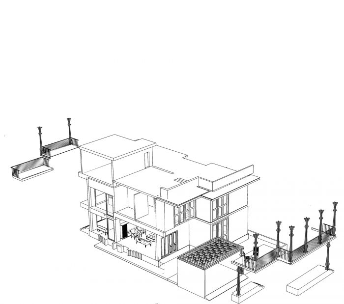 The design developed from the client’s brief, which was to have a modern house inspired by the family’s roots in Kerala, India. We looked towards traditional palace construction of Kerala for inspiration. We noticed a few key features that most of these structures portrayed, such as - the verandah that wrapped the living spaces all around, the appearance of a heavy masonry base on the ground floor, with thick arches and carved columns and a first floor which appeared to be lighter in terms of materials and overall treatment. This became the inspiration for the front façade of the building. Carved columns, which are a prominent element of traditional Kerala architecture, were adopted but with a contemporary twist.