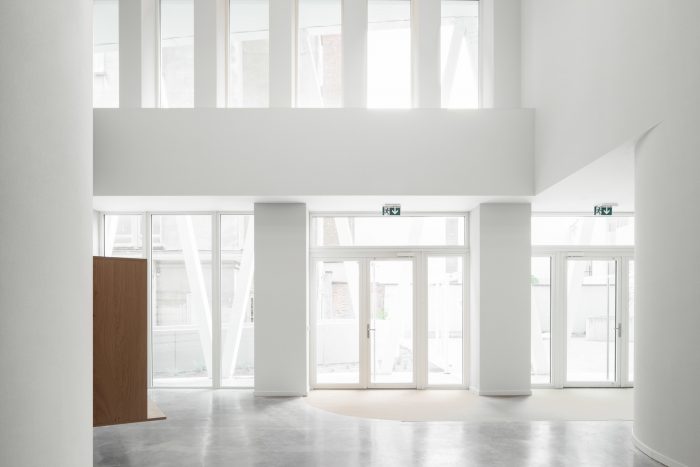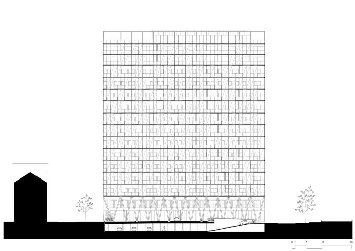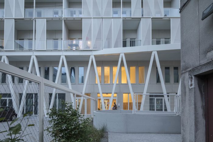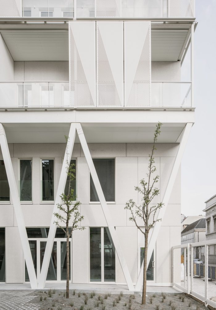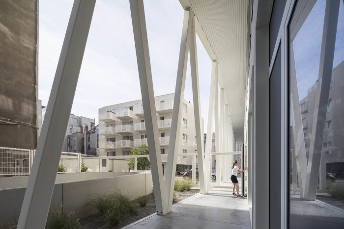 The linearity of the existing volume and the porosity of the site were reinforced by the creation of double-high V-shaped colonnades running along the ground floor and defining sheltered pedestrian circulation leading to the building's main entrance. Above these colonnades, a lightweight white scaffold-like steel structure supports generous balconies. Movable perforated screens elegantly provide shading from the sun as well as protection from the wind. In the South-East corner of the site, a mid-rise housing block with 26 units was added continuing the street facade of Rue du Canal.