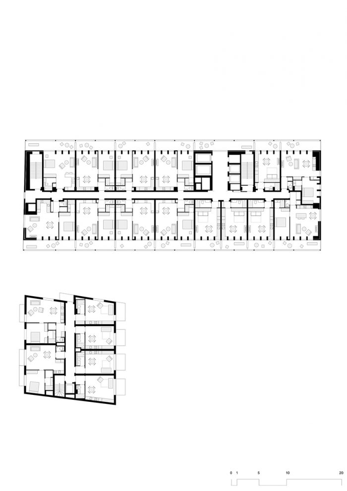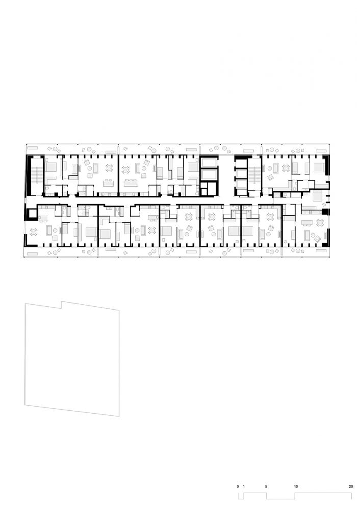 现有体量的线性和场地的多孔性通过沿底层的双高V形柱廊得到加强,并定义了通往建筑主入口的人行通道。在这些柱廊之上,一个轻质的白色脚手架式钢结构支撑着宽大的阳台。可移动的穿孔屏风优雅地提供了遮阳和避风的功能。在场地的东南角,增加了一栋有26个单元的中层住宅楼,延续了运河街的街面。