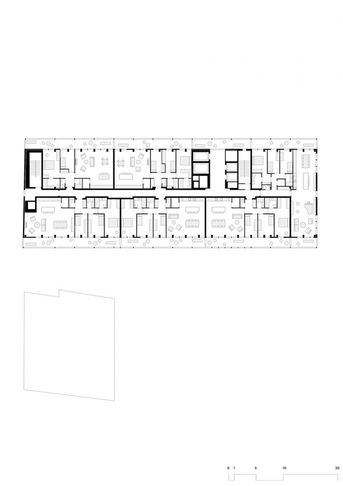在Quai aux Pierres de Taille,一个已不复存在的布鲁塞尔港口的前码头,周围是旧仓库,旁边是皇家弗拉芒剧院,一座60年代的办公塔楼拔地而起。建筑的风格和规模与当地的城市结构形成了鲜明的对比,但由于其垂直于街道的植入,这座塔楼依然低调,常常不被人注意。该项目将该建筑深刻地转变为一个多功能的综合体,包括130个单元,分为各种不同的住宅,从紧凑的智能工作室到宽敞的三卧室公寓。