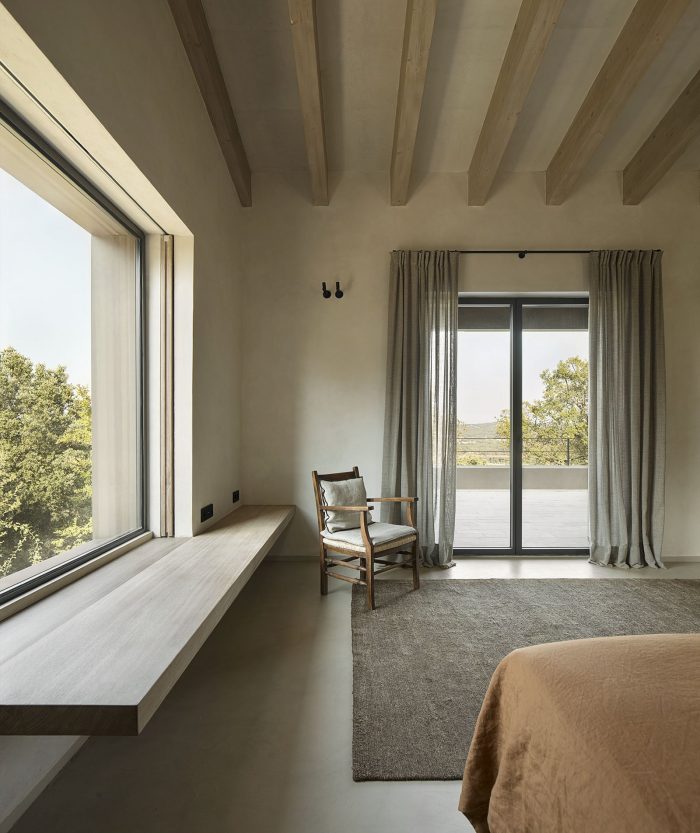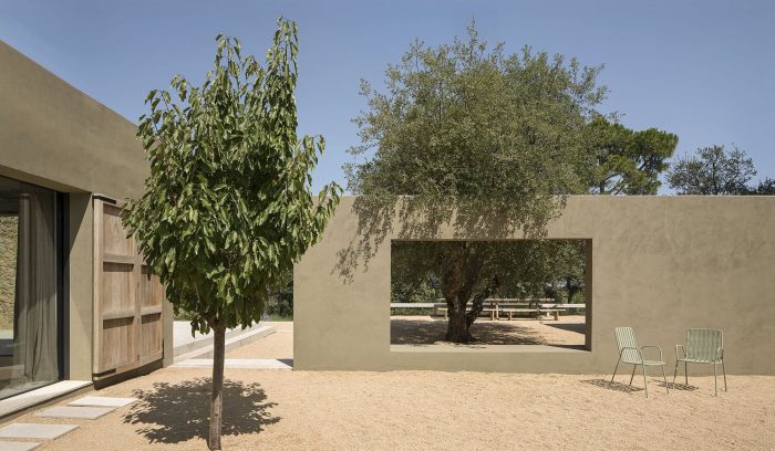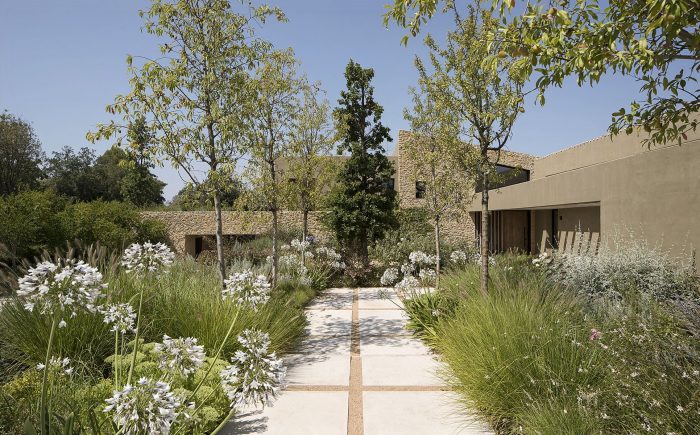 The outdoor spaces are structured by terraces that give the area around the house the appearance of farmland.
