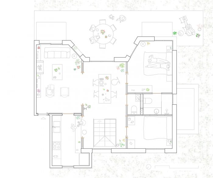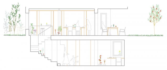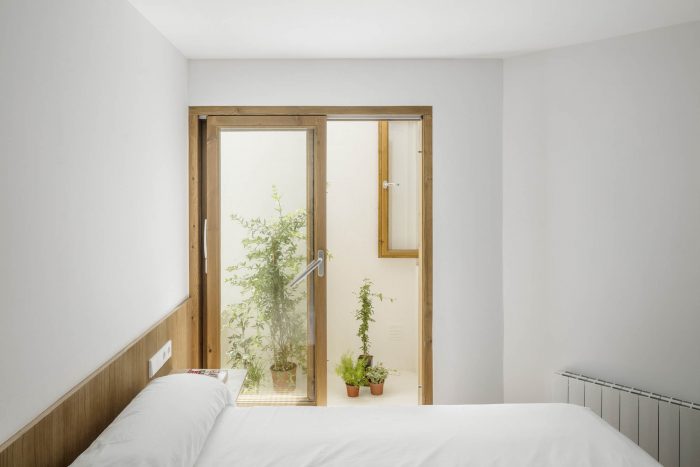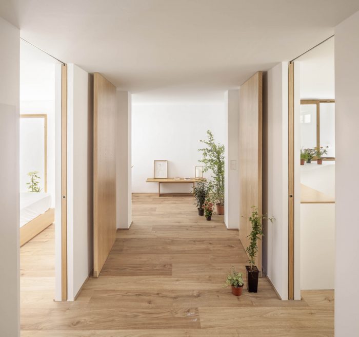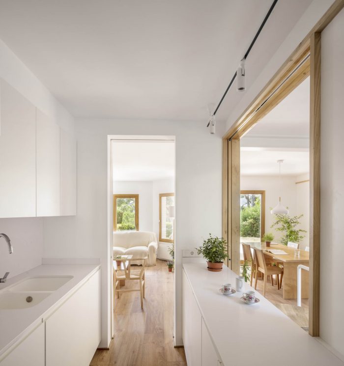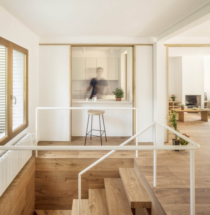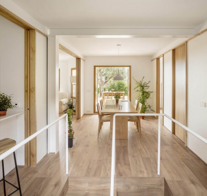The original one-story house was completely excavated to achieve an underground floor that doubles its interior area, responding to the family needs of the owners. The three inner courtyards enabled to easily extract the soil while generating new inhabited abstract rooms, that provide light and ventilation to the basement bedrooms. The existent foundations, together with the load-bearing walls and perimeter re-taining walls, define the new underground floor layout. New partitions were built to establish a circulation area that crosses the space from the south-facing courtyards to the staircase, which captures the northern light and extends the oak pavement to the up-per floor. This central space with a changeable use of living room promotes cross ventilation and the incidence of natural light, while enhancing the visual depth of the dwelling. In addition to this, the energy efficiency improves with the use of soil thermal inertia, which regulates the indoor temperature in both summer and winter.