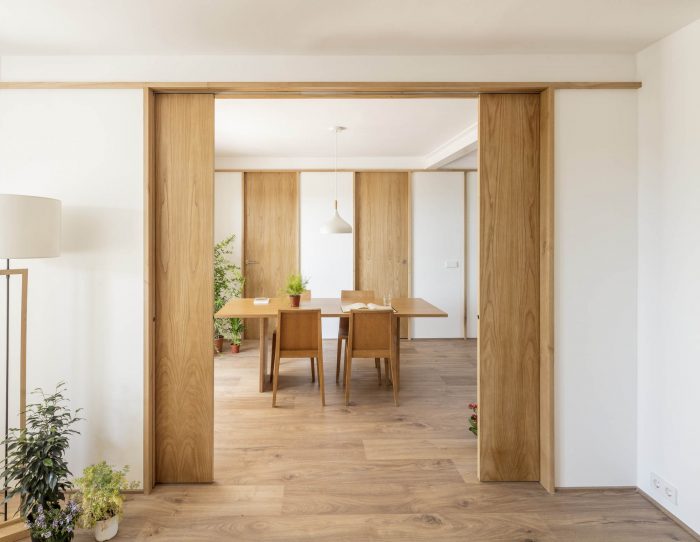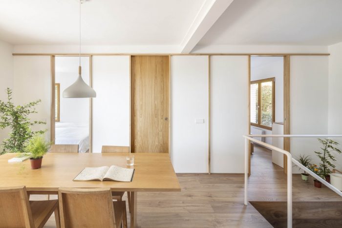 On the ground floor, a new opening was set up by a structural reinforcing beam in the load wall, con-necting the terrace and the back garden through the dining room and staircase. This intervention origi-nates a new interstitial space that allows the creation of two facing wooden modular partitions, unifying the different house units in a harmonious flexible spatial composition. The new interior visuals, high-lighted by timber frames, link the rooms to each other and the surrounding garden, while providing a greater perception of spatial depth. In one of the divisions, the sliding doors open the living room and kitchen bar, while in the other, doors open the private units such as the two bedrooms and toilet. The design strategy, construction system and aesthetics are inspired by the partitions of traditional Japanese houses, where fixed and mobile panels known as “fusuma” create an abstract landscape. A light timber framework supports the panels; the fixed ones are white lacquered wood boards while the mobile ones are made by natural chestnut wood. The presence of these mobile elements leads to changing boundary spaces that encourage na-ture and light to come inside the dwelling.