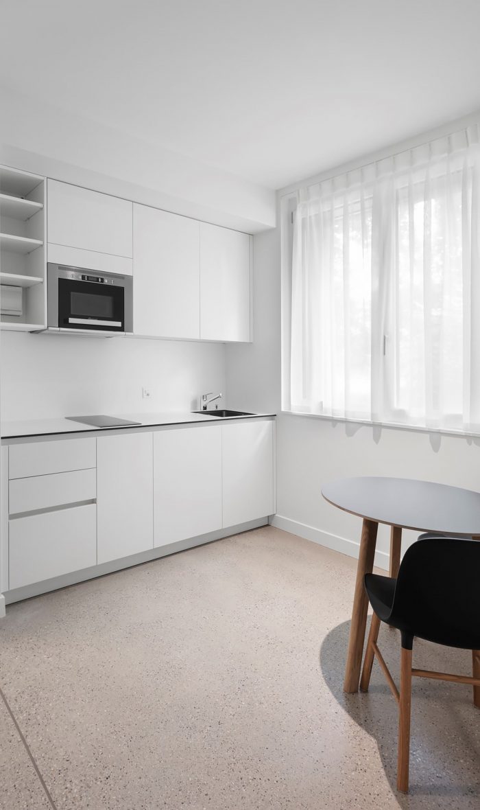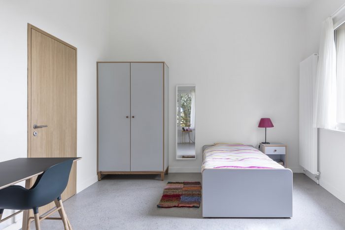 Programme: a "capable" architecture. Particular attention is paid to the bedroom and study area. The aim is to offer residents a very comfortable and intimate living space, benefiting from framed views of the garden and the horizon. Each room is designed to be different from the others by allowing for multiple layout possibilities (bed, desk, wardrobe position) and through the geometries that are intentionally non-orthogonal at two angles. The result is an open and dynamic space. Additionally, the location of the windows is different for each room, which makes them even more exclusive.