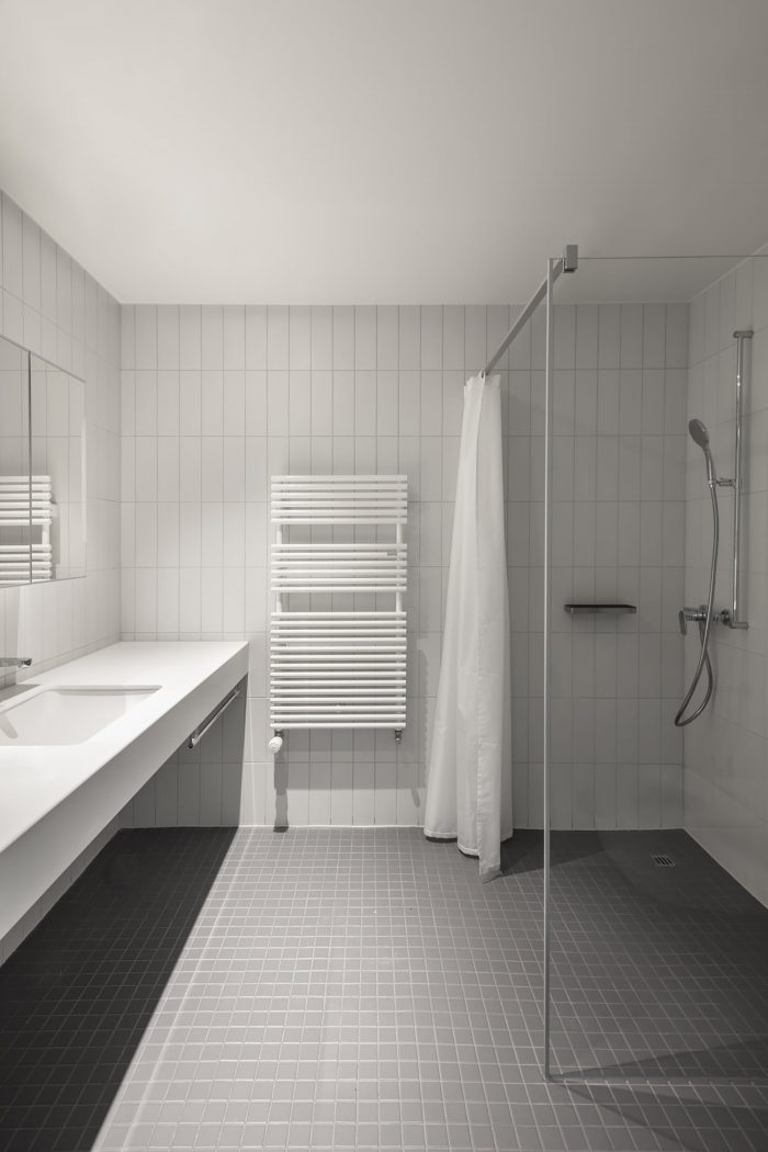 在住宅楼层,中转区被设计成通往环境的 "窗户",而且是以横向的方式。这些地方也提供共享的休闲区,其布局允许居民阅读、工作或聊天。这两座建筑的底层设计使公共空间向一个方向良好的露台开放,与连接两个项目外部空间的绿荫庭院相连。入口处经过精心设计,有气闸,并能方便地进入更衣室。一楼的活动是流畅的,并与楼梯明确衔接,这得益于视觉上连接两个楼层的空间性。因此,这些空间在视觉上被大面积的室内窗户连接起来,为彼此之间的联系以及与景观的联系提供了可能性。杂物间可以看到楼梯和入口,为管理员提供更舒适的工作环境。