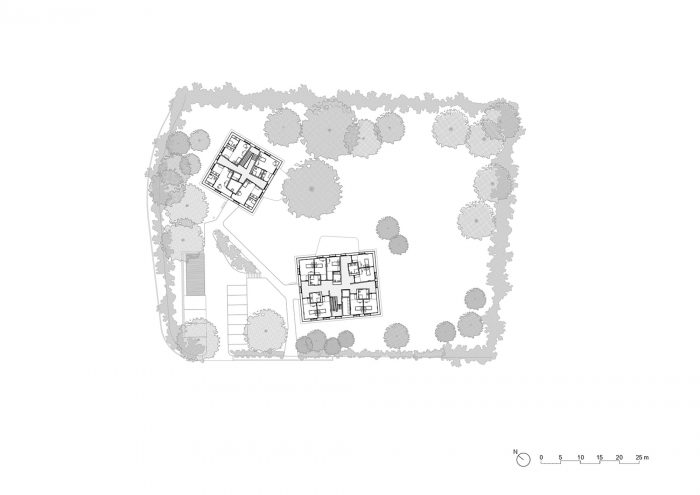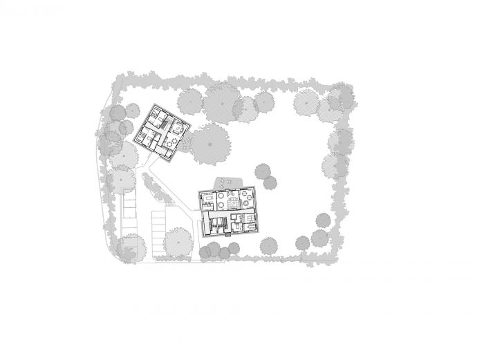 地点--一个依靠的地方。该项目首先寻求尽可能地保护场地,由于那里存在的自然环境,所以特别有质量。这种保护绿色和树状空间的选择,也整合了未来的建筑场地,导致在场地顶部的形态分组,定位它们,使砍伐的树木数量最少。