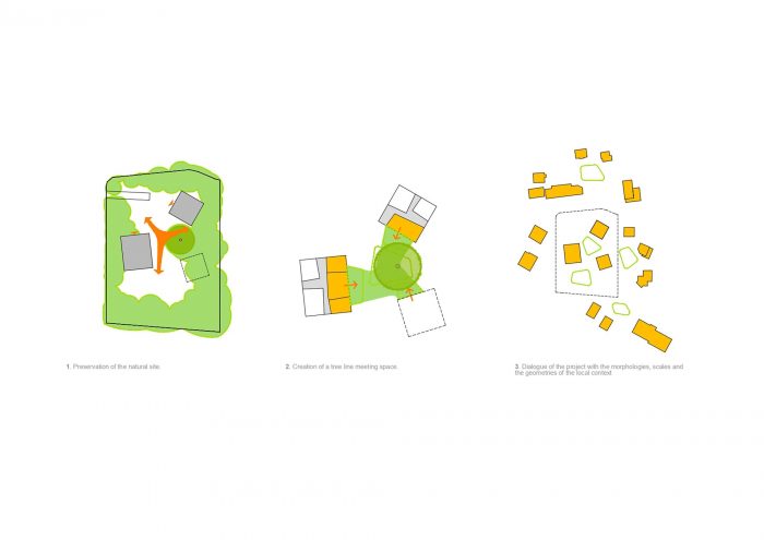 Location – a place of reliance. The project first of all seeks to safeguard the site as much as possible, which is particularly qualitative due to the nature present there. This choice of preserving the green and arboreal spaces, also integrating the future construction site, led to grouping the morphologies at the top of the site, positioning them so that the minimum number of trees are cut down.