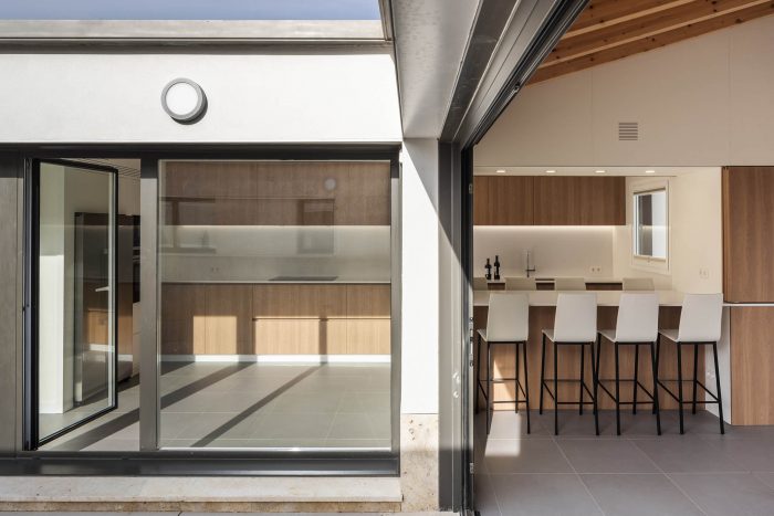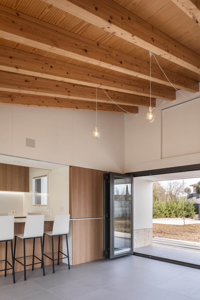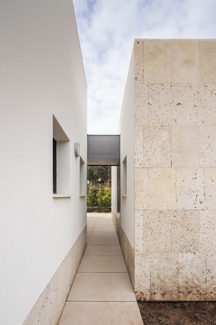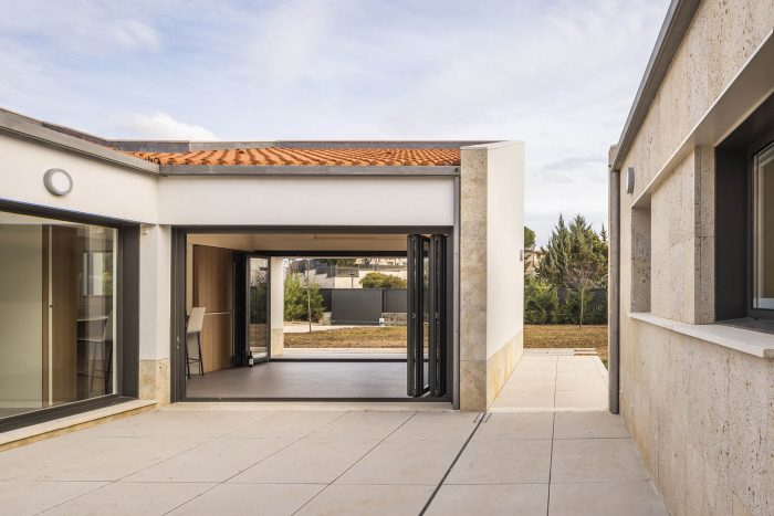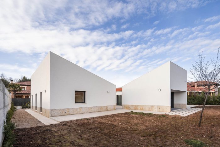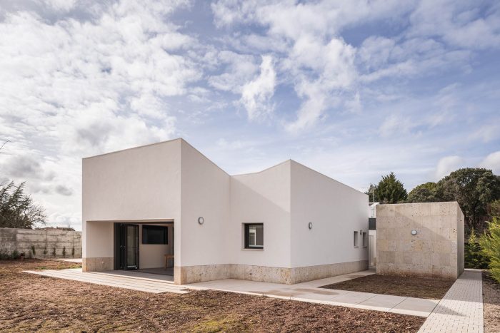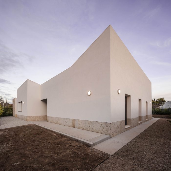 The house is located on the northwest side of the plot, whose front is completed with a detached pavilion used as a cellar. On the southeast front, there is access for vehicles and a paved surface for parking. The main access makes it possible to identify the succession of open spaces in a linear scheme (access, patio, and back of the plot) and the structure of closed spaces forming an almost complete ring. The dining room, which replicates the living room on the main façade, delimits the patio to the south and is conceived as a space that can be completely opened to both the patio and the rear garden, allowing, depending on the moment, to privilege some relationships over others in the central void of the house. The simple initial volume – a prism pierced by an interior patio – becomes more complex articulated by the combination of the program and the roof. The house is thus an aggregation of rooms with different characteristics, organized around the patio. The traditional use of tile roofs sloping toward the patio produces a contrast between the scale and regularity of the façades that delimit it, and the external façades, with a variety of heights and more complex geometry, responding to the different depths of the rooms.
