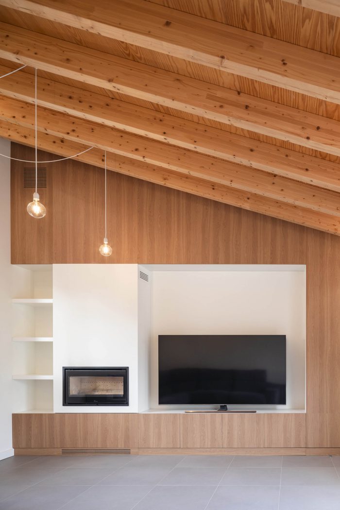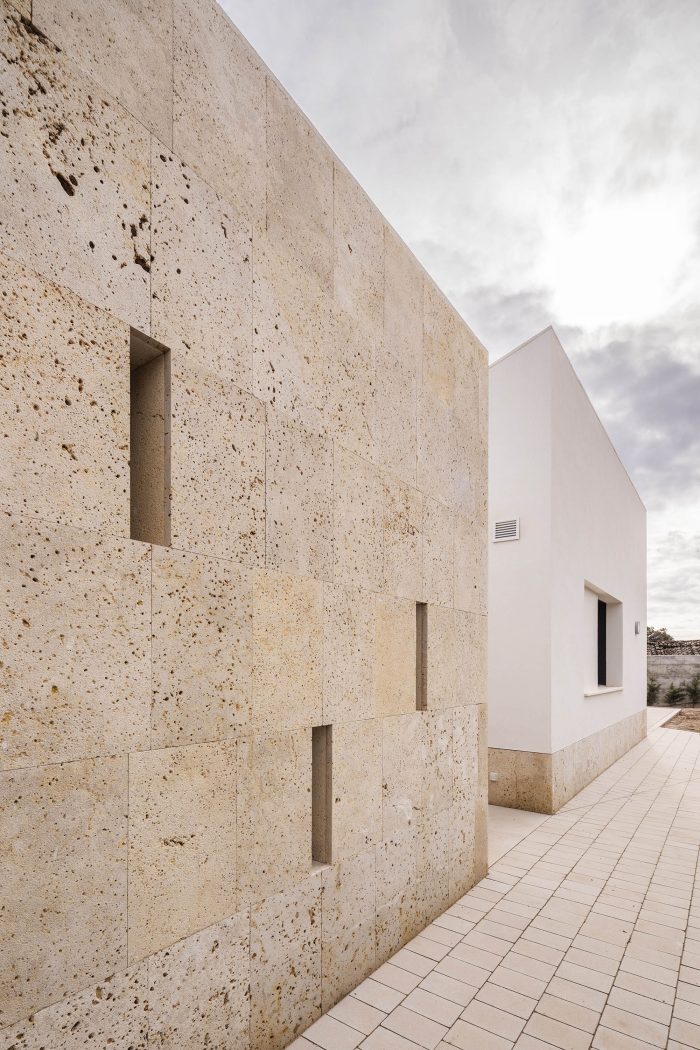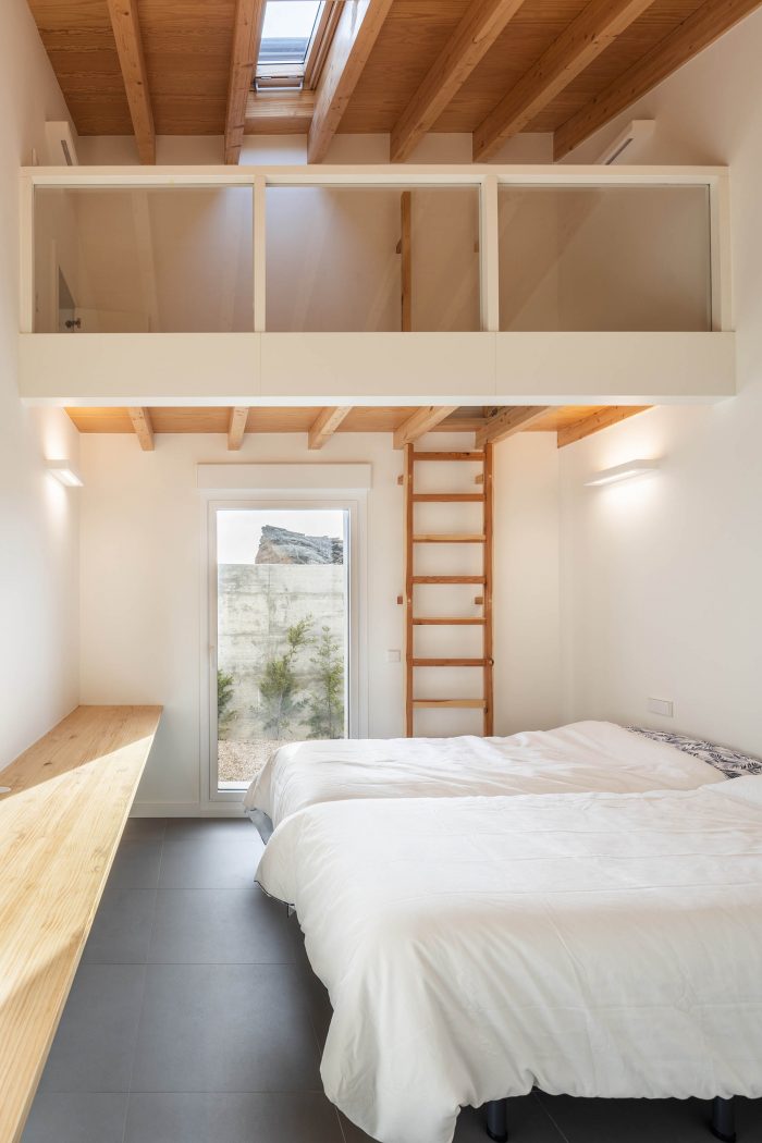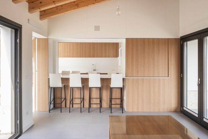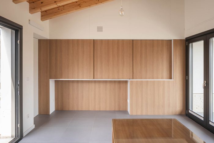 The systems chosen correspond to an updated traditional construction – load-bearing walls, traditional tile roofs on wooden decks –, and the exterior cladding also seeks this link with the environment –lime plaster and stone cladding from the area. In the interior spaces, the treatment is similar – light-colored walls and floors, exposed roof structure –, although in the more public areas the functional cladding elements are highlighted with wooden paneling.