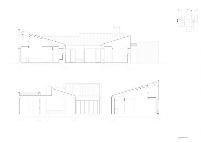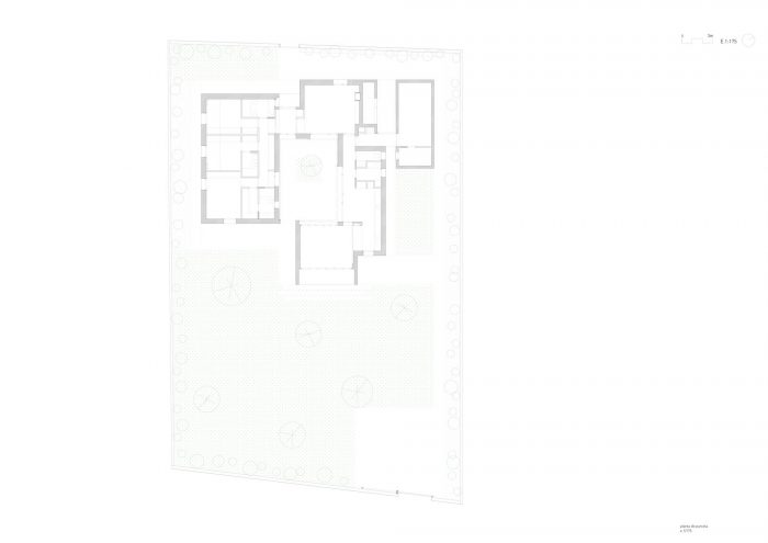 房子位于地块的西北侧,其正面有一个用作地窖的独立亭子。在东南面,有车辆通道和一个铺设好的停车场。主要通道使我们有可能识别出线性方案中的开放空间(通道、天井和地块背面)和封闭空间的结构,形成一个几乎完整的环。餐厅,复制了主立面上的客厅,将天井限定在南部,并被设想为一个可以完全向天井和后花园开放的空间,允许根据不同的时刻,在房子的中央空隙中优先考虑一些关系。简单的初始体量--一个被内部天井穿透的棱镜--通过程序和屋顶的组合变得更加复杂。因此,房子是一个具有不同特点的房间的集合体,围绕着天井组织。传统的瓦片屋顶向天井倾斜,在划定天井的立面和外部立面的规模和规则性之间产生了对比,外部立面具有不同的高度和更复杂的几何形状,以回应房间的不同深度。