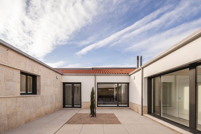 This courtyard house is built on the outskirts of a small town, on a regular, flat plot, with access from two opposite sides. The program defined by the promoters corresponds to a habitual residence, in which social activities are also planned. The organization around the patio makes it possible to compact the rest areas and separate them from the spaces with an intended public use – the kitchen and dining room.