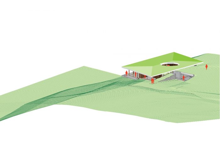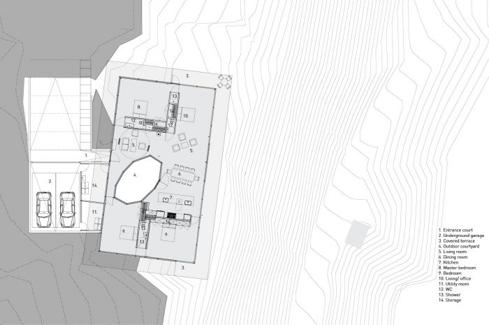 In contrast to a conventional residence, the Courtyard House is programmed as an inhabited landscape contained within a modernist slab: a single level compressed between a floor and roof plane. A glass wrapper is setback from the roof's edge to create a walk-around covered terrace that activates the surrounding landscape by physically and communally connecting inside to out. Inside, the rooms are conceived as a continuous sequence of event spaces. Each room is equipped for the varying performances of daily living, framed by the outside, suggesting an architecture of simplicity and harmony between the built and the vegetal.