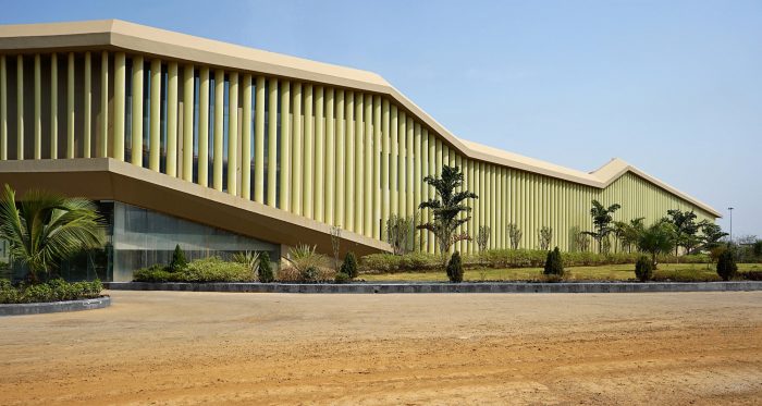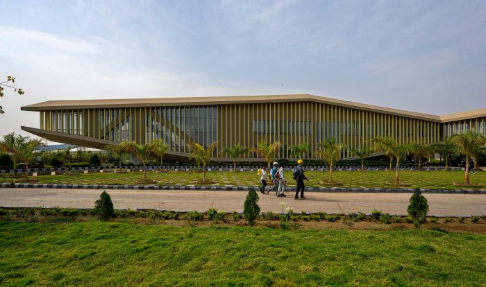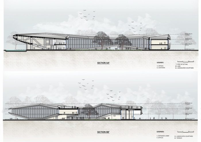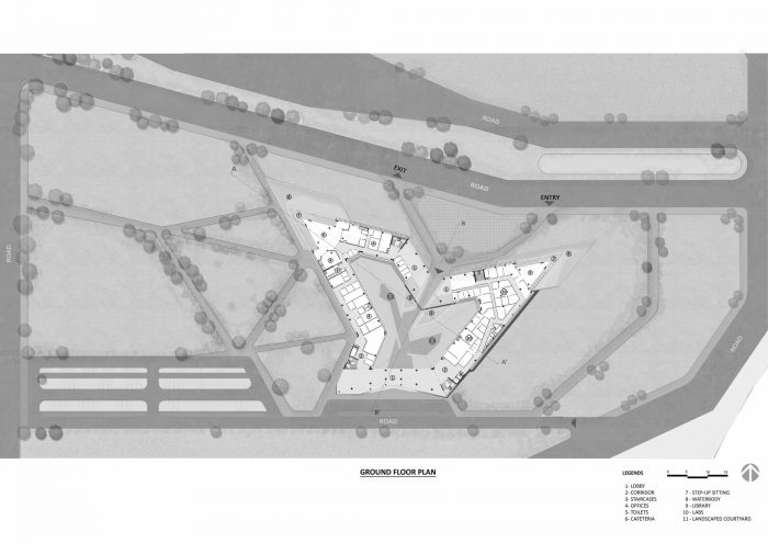 A linear office space twists organically in the plan, creating a large landscaped courtyard within it. Varying from two to four levels sectionally, the office floors are lifted from the ground at the southwest and northeast sides to facilitate a south-westerly breeze through the courtyard.