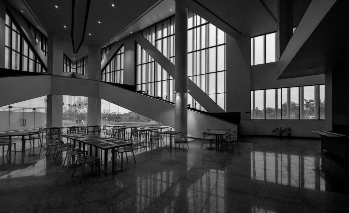 The northeast and northwest corners of the building are also lifted, creating singular large volumes at both ends to allow visual contact between floors, where a cafeteria and a library are housed. The circulation spine skirts the internal courtyard, allowing the landscape to be visible while moving through the office and the work areas, skirting the external periphery opening towards external gardens.