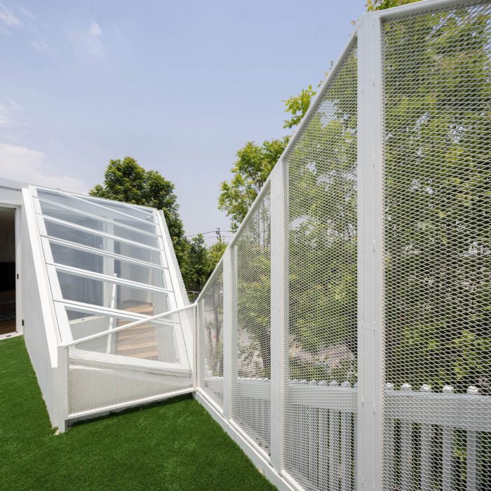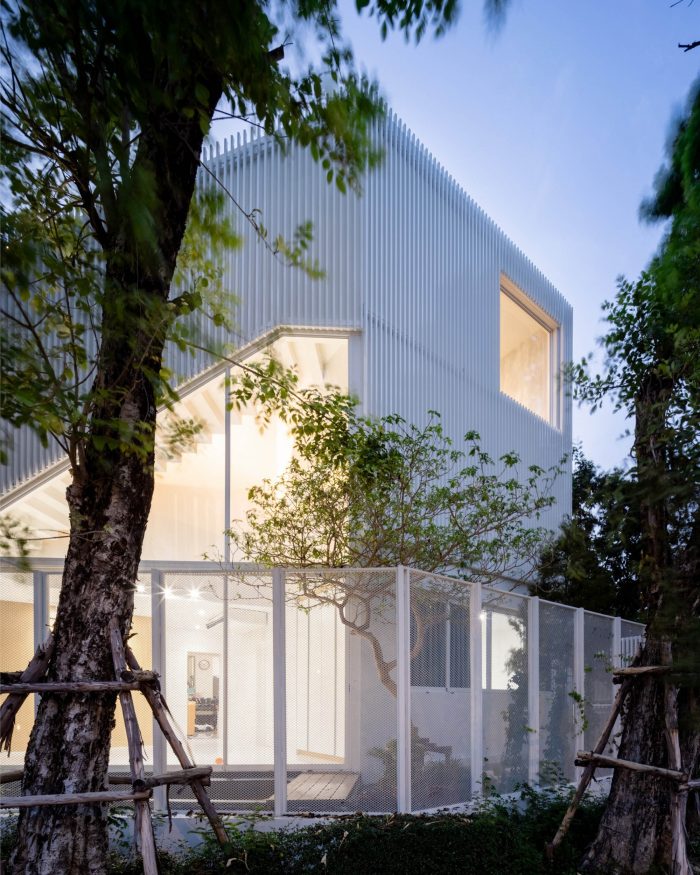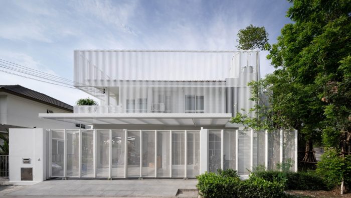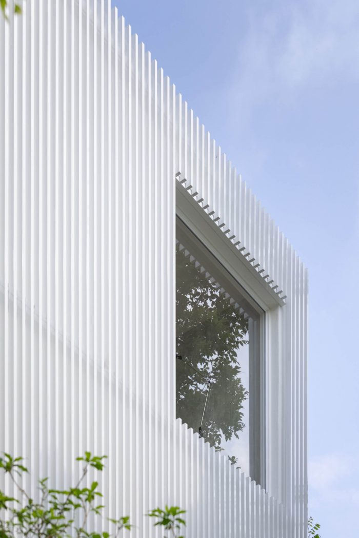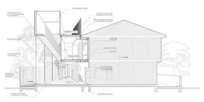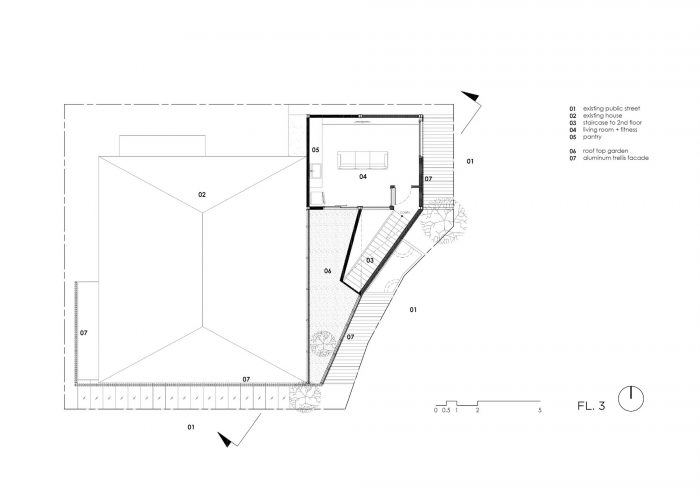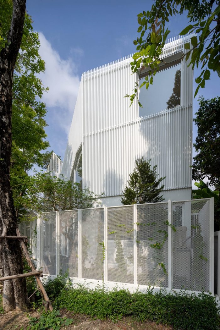 As the house located at the corner while privacy is needed, façade cover is required. Vertical aluminum trellis together with perforated metal are used to cover all cove, continuing to an existing house, to harmonize both buildings.